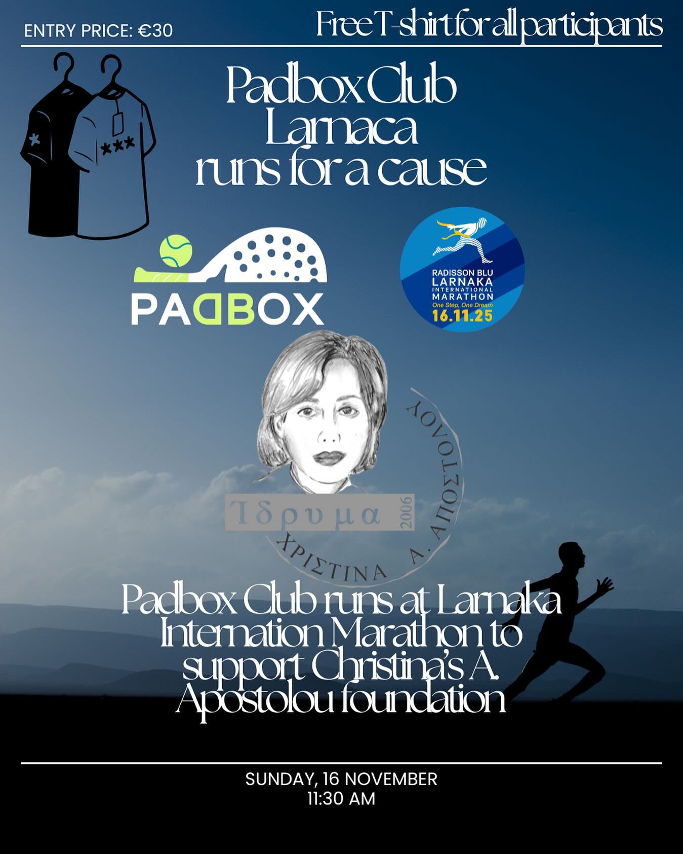 Η ομάδα του Padbox Club Larnaca θα συμμετάσχει δυναμικά στον Radisson Blu Διεθνή Μαραθώνιο Λάρνακας, που θα πραγματοποιηθεί την Κυριακή, 16 Νοεμβρίου 2025, στις 11:30 π.μ., τρέχοντας για έναν σκοπό που αξίζει κάθε βήμα – τη στήριξη του Ιδρύματος Χριστίνα Α. Αποστόλου.