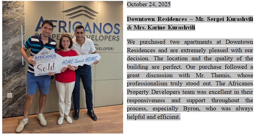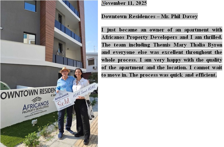 Για περισσότερες πληροφορίες για τα έργα της Africanos Property Developers, η ομάδα είναι διαθέσιμη καθημερινά από τις 8:00 -17:30 για συναντήσεις κατ’ ιδίαν ή  και τηλεφωνικώς στο +357 24-828161 ή και στέλνοντας email στο: sales@africanosproperties.com .
