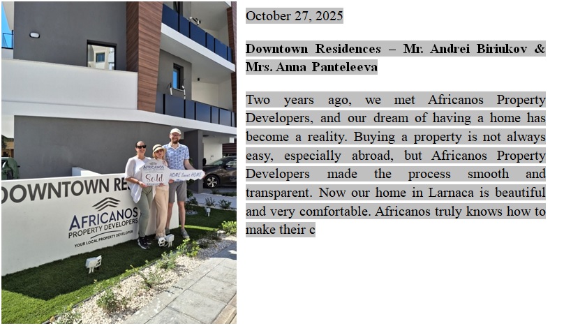 Η Africanos Property Developers συνεχίζει να επενδύει στη Λάρνακα, δημιουργώντας έργα υψηλής αισθητικής και ποιότητας που αναβαθμίζουν την πόλη και προσφέρουν στους κατοίκους έναν ανώτερο τρόπο ζωής.
