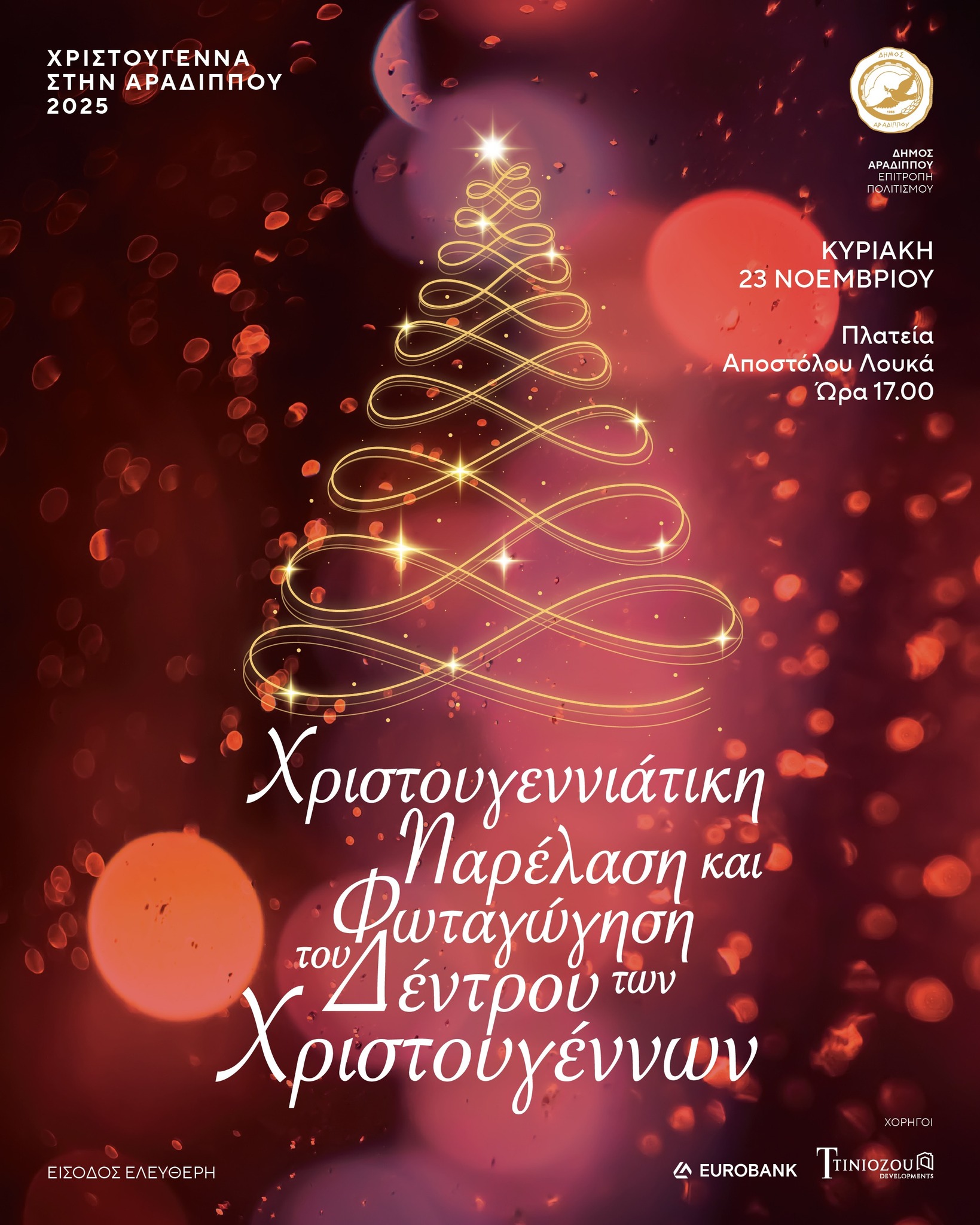 Ο Δήμος Αραδίππου και η Επιτροπή Πολιτισμού σας προσκαλούν σε μια εκδήλωση γεμάτη λάμψη, μουσική και χριστουγεννιάτικη μαγεία, που θα σηματοδοτήσει επίσημα την έναρξη των φετινών εορταστικών εκδηλώσεων της πόλης μας την Κυριακή 23 Νοεμβρίου 2025 στην Πλατεία Αποστόλου Λουκά και ώρα 5.00 μ.μ.