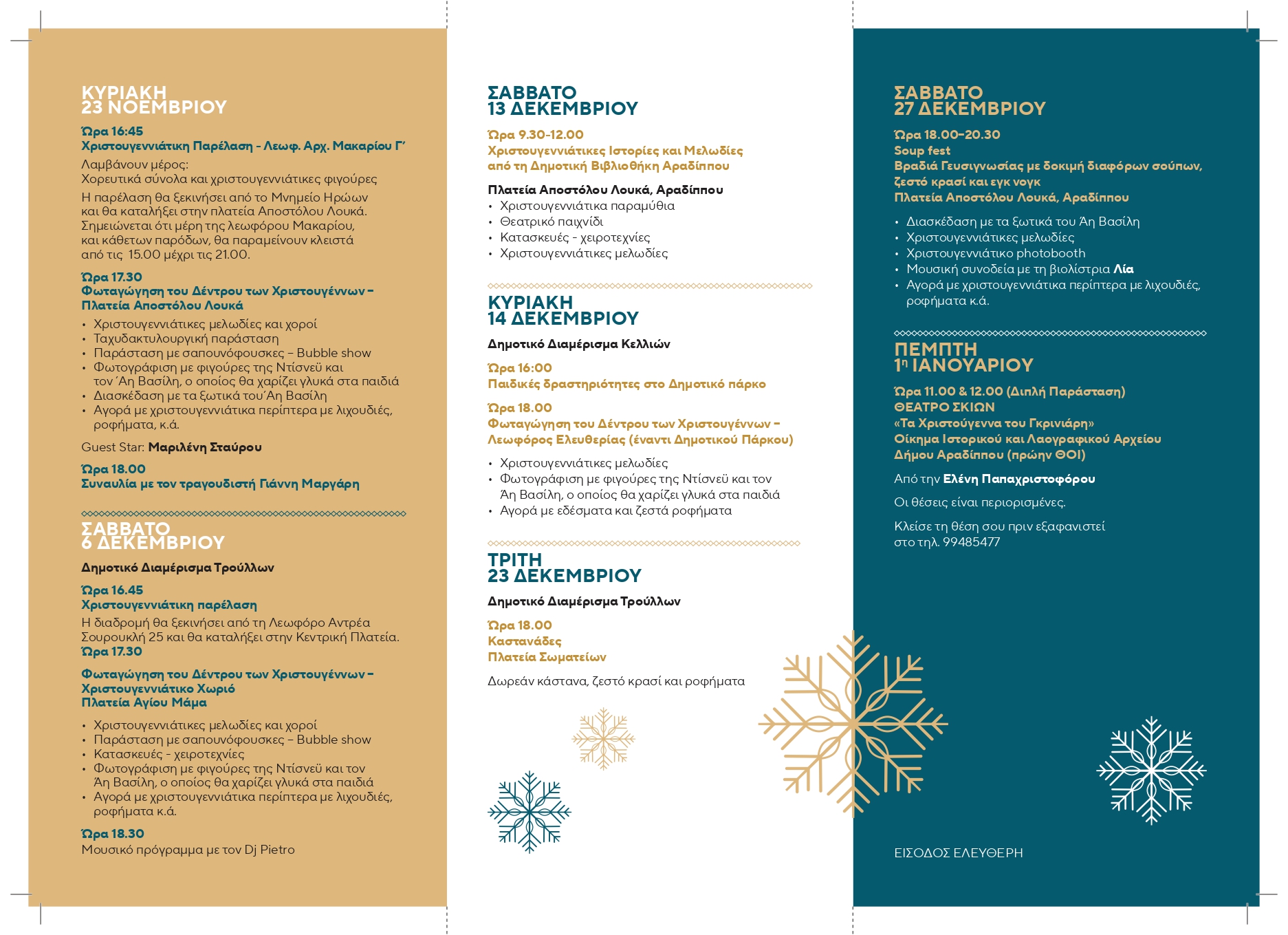 Το Φεστιβάλ Σούπας επιστρέφει στην Αραδίππου και για άλλη μια φορά φέρνει κοντά την κοινότητα σε μια μοναδική, ζεστή εκδήλωση! Η πλατεία του Απόστολου Λουκά μεταμορφώνεται το Σάββατο 27 Δεκεμβρίου 2025 από τις 6.00 μ.μ. μέχρι και τις 8.30 μ.μ., σε ένα μεγάλο σημείο συνάντησης, όπου μικροί και μεγάλοι γίνονται μια οικογένεια, απολαμβάνοντας γεύσεις γεμάτες θαλπωρή και παράδοση.