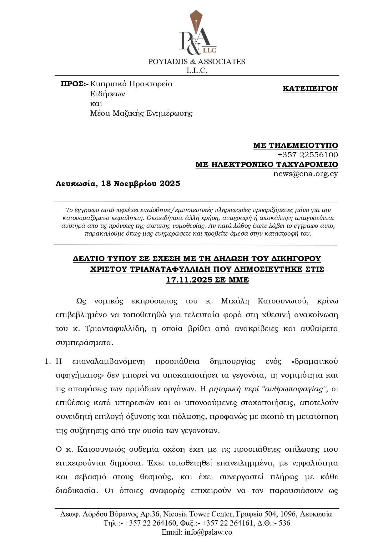 Σε ανακοίνωση, υποστηρίζει ότι η χθεσινή ανακοίνωση του κυρίου Τριανταφυλλίδη «βρίθει από ανακρίβειες και αυθαίρετα συμπεράσματα» και κάνει λόγο για επαναλαμβανόμενη προσπάθεια δημιουργίας ενός «δραματικού αφηγήματος.»