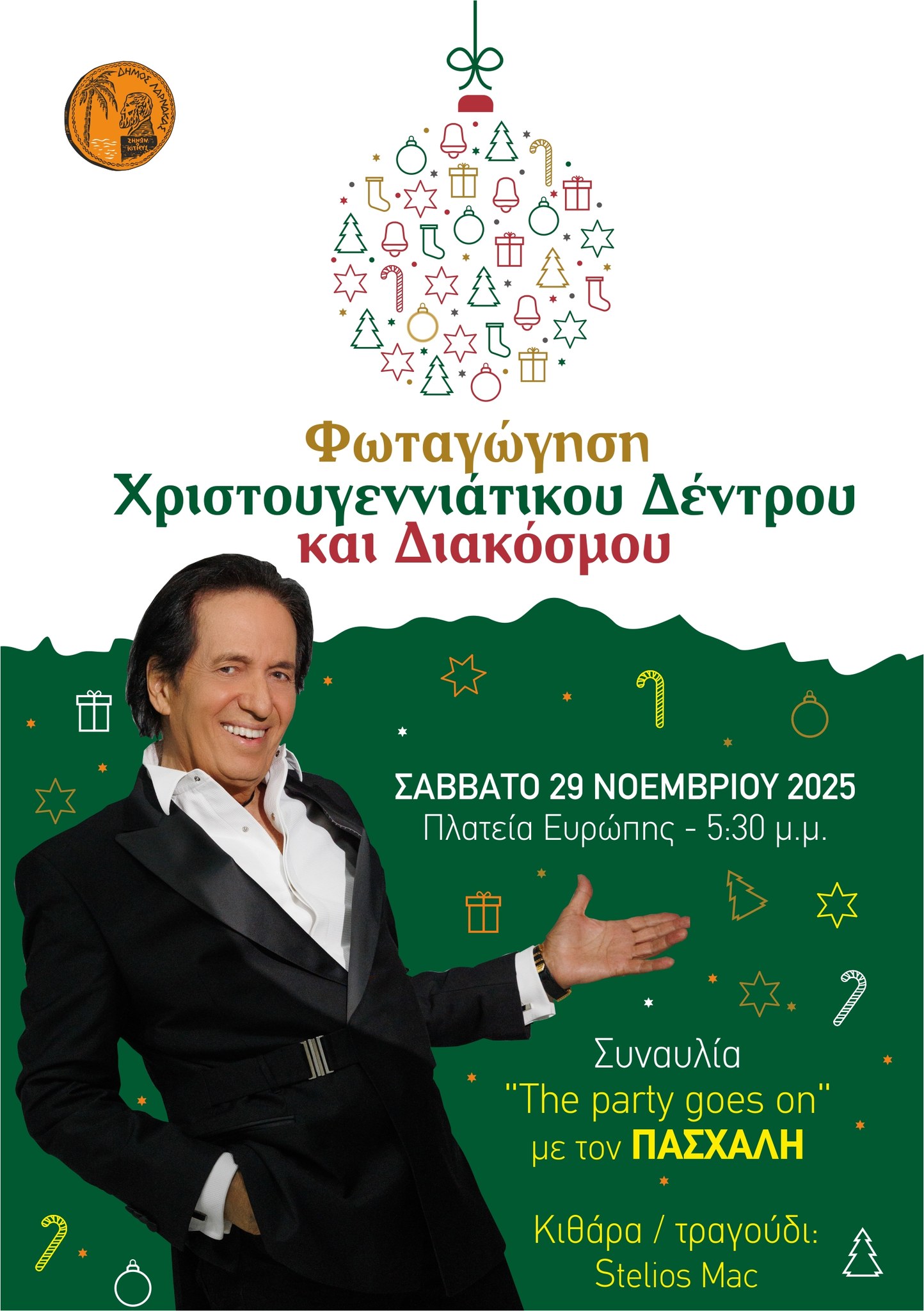 Η βραδιά θα ολοκληρωθεί με τη συναυλία «The Party goes on» με τον Πασχάλη, συνοδευόμενο από τον Stelios Mac στην κιθάρα και στο τραγούδι. Ένα πρόγραμμα γεμάτο ενέργεια και θετική διάθεση, ιδανικό για την επίσημη έναρξη της εορταστικής περιόδου.