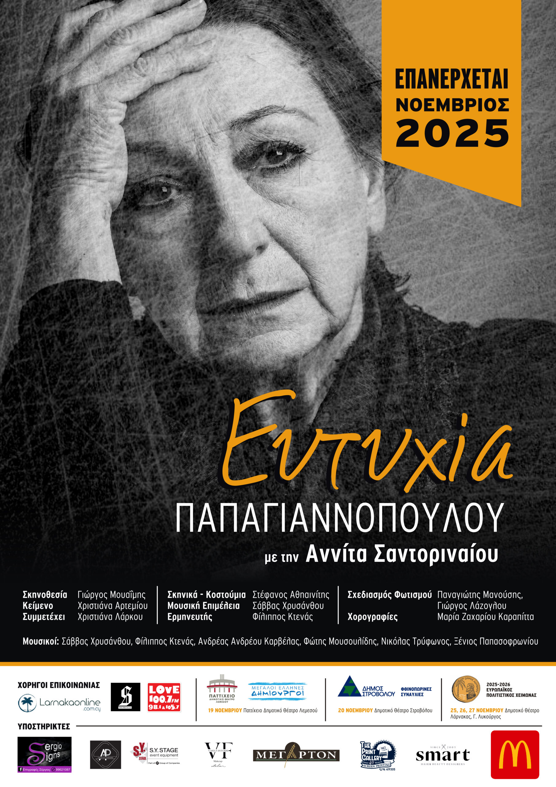 Η παραγωγή στη Λάρνακα στις 25 / 26 / 27 / Νοεμβρίου 2025, εντάσσεται στις εκδηλώσεις του Ευρωπαϊκού Πολιτιστικού Χειμώνα του Δήμου Λάρνακας, που θα πραγματοποιηθούν στο Δημοτικό Θέατρο Λάρνακας, Γεώργιος Λυκούργος.