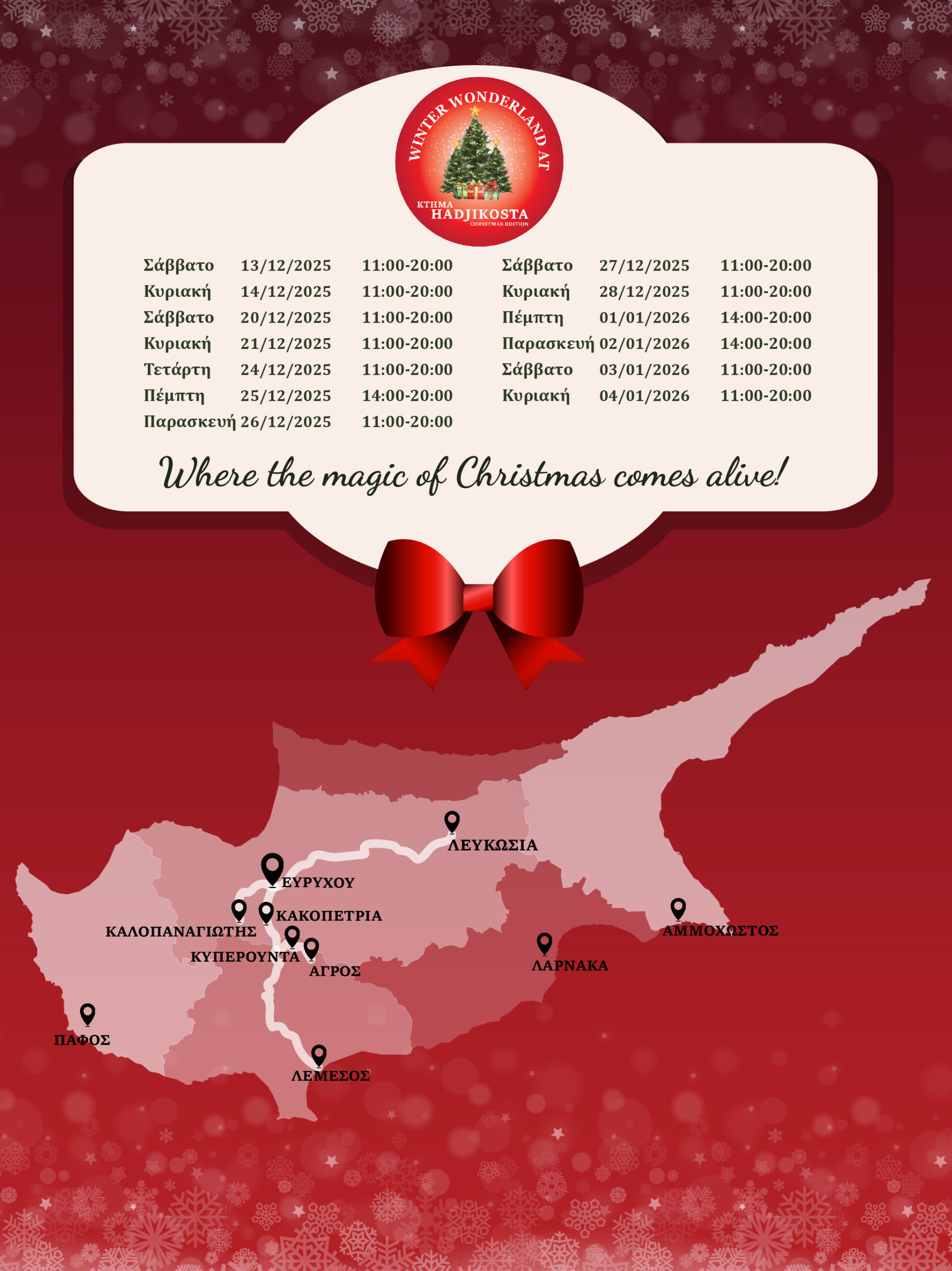 Το Winter Wonderland at Ktima Hadjikosta θα λειτουργήσει στις εξής ημερομηνίες: 13–14 Δεκεμβρίου, 20–21 Δεκεμβρίου, 24–28 Δεκεμβρίου και 01–04 Ιανουαρίου, προσφέροντας σε κάθε επίσκεψη μια ολοκληρωμένη γιορτινή εμπειρία. Με ξύλινα περίπτερα, φωτεινές εγκαταστάσεις, θεματικές γωνιές φωτογράφισης και γιορτινές μυρωδιές που ταξιδεύουν τον επισκέπτη από την πρώτη στιγμή, το Winter Wonderland at Ktima Hadjikosta υπόσχεται μια χριστουγεννιάτικη εμπειρία που θυμίζει παραμύθι.