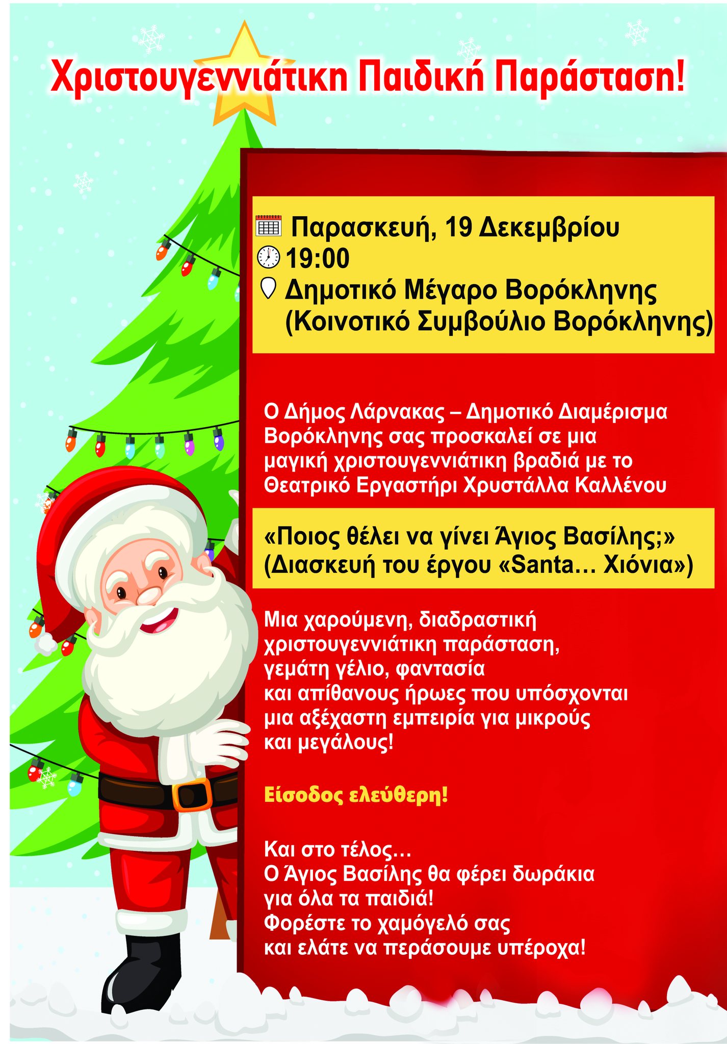 Ο Δήμος Λάρνακας – Δημοτικό Διαμέρισμα Βορόκληνης, σας προσκαλεί την Παρασκευή 19 Δεκεμβρίου στις 19:00 στο Δημοτικό Μέγαρο Βορόκληνης, (Κοινοτικό Συμβούλιο Βορόκληνης) σε μια μαγική Χριστουγεννιάτικη βραδιά με τους Θεατρικό Εργαστήρι Χρυστάλλας Καλλέννου “Ποιος θέλει να γίνει Άγιος Βασίλης; ” (Προσαρμόστηκε από το έργο “Άη Βασίλης… Χιόνι”)
