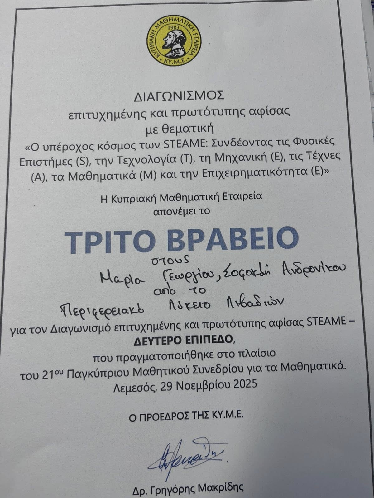 Η Κυπριακή Μαθηματική Εταιρεία και το Ίδρυμα ΘΑΛΗΣ, διοργάνωσαν το CYPRUS STEAME FESTIVAL 2025, Το Φεστιβάλ φιλοξενήθηκε στο Λύκειο Λινόπετρας στη Λεμεσό.
