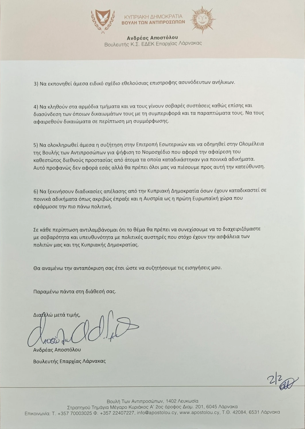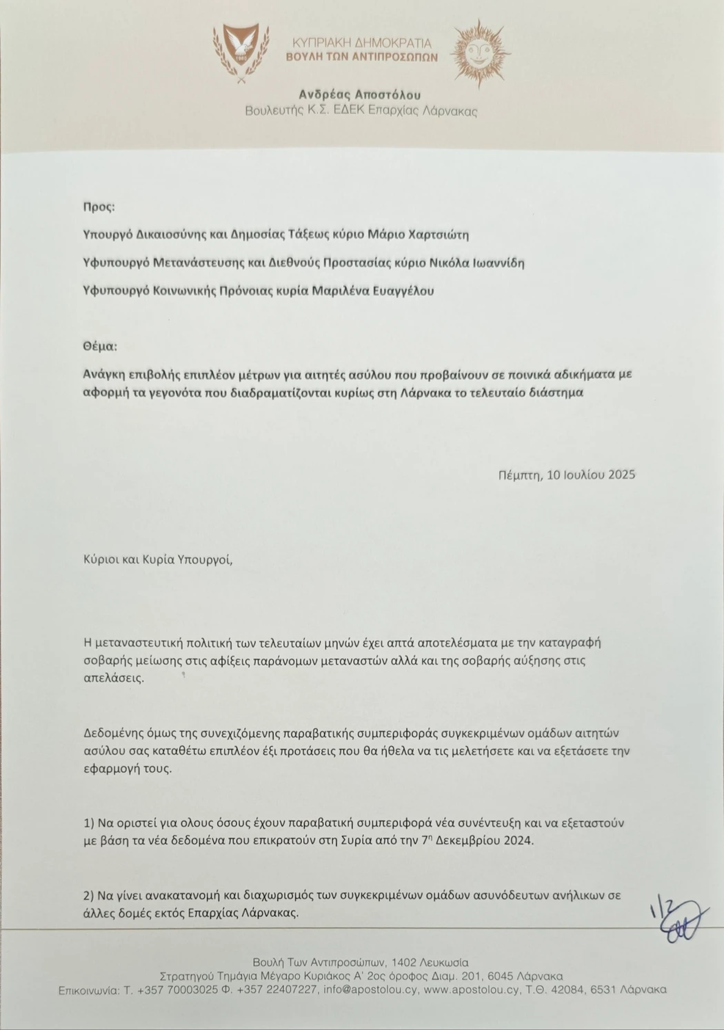 Ο Βουλευτής της Επαρχίας Λάρνακας, Ανδρέας Αποστόλου δήλωσε χθες Πέμπτη (04/12) στη Βουλή ότι στηρίζει μια αυστηρή μεταναστευτική πολιτική καθώς και τις προσπάθειες του Υφυπουργού Μετανάστευσης Νικόλα Ιωαννίδη, σημειώνοντας ότι η ασφάλεια των Κυπρίων πολιτών είναι προτεραιότητα και ότι οι παρανομούντες πρέπει να απελαύνονται.