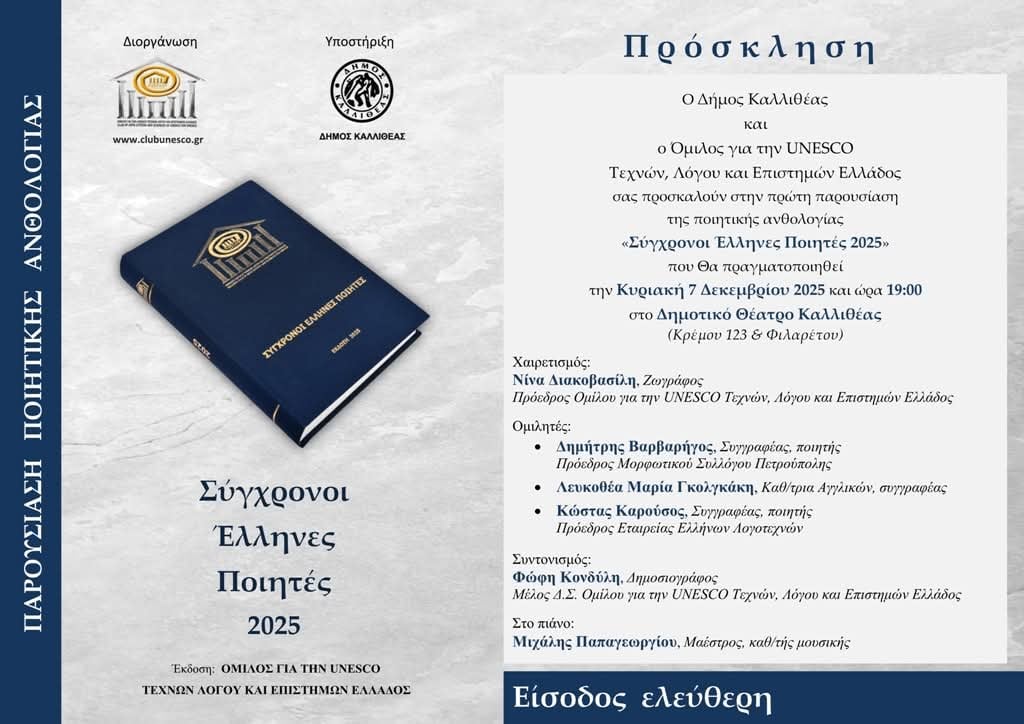 Τιμή, χαρά και ευλογία ήταν τα συναισθήματα από τα οποία ξεχείλιζε η ψυχή του λαϊκού μας ποιητή και συγγραφέα Αντώνη Γαβριήλ Παπά αυτές τις μέρες μιας και στις 7/12/2025 ,παρουσία μεγάλων προσωπικοτήτων του χώρου της τέχνης, της πολιτικής κλπ, στο Δημοτικό Κηποθέατρο Καλλιθέας, θα παρουσιαστεί η 2η διεθνής συλλεκτική ποιητική ανθολογία «Σύγχρονοι Έλληνες Ποιητές 2025» από τις Έκδοσης Ομίλου για την UNESCO Τεχνών, Λόγου & Επιστημών Ελλάδος, το οποίο εκδίδετε κάθε 10 χρόνια και στο οποίο φέτος ήταν ο μόνος κύπριος ποιητής, του οποίου επιλέγηκαν ποιήματα για να συμπεριληφθούν σ’ αυτήν την έκδοση.