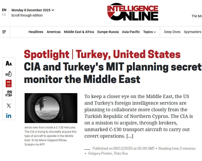 Σύμφωνα με δημοσίευμα της ειδησεογραφικής ιστοσελίδας Intelligence Online ()8/12/25), η CIA και η τουρκική υπηρεσία πληροφοριών MİT σχεδιάζουν να δημιουργήσουν μυστική αεροπορική βάση στα κατεχόμενα, που θα χρησιμοποιηθεί για επιτήρηση της Μέσης Ανατολής.