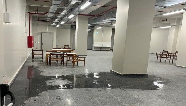 Σύμφωνα με μαρτυρίες εργαζομένων και αρμόδιων λειτουργών, σε διάφορα σημεία του κτιρίου παρατηρήθηκαν σοβαρές διαρροές από την οροφή, οι οποίες οδήγησαν στη δημιουργία σημαντικών λιμναζόντων υδάτων σε διαδρόμους και κοινόχρηστους χώρους. Οι εικόνες των βρεγμένων δαπέδων στους μεγάλους διαδρόμους του Μεγάρου που δημοσίευσε η Kibris Postasi προκάλεσαν εντύπωση και ανησυχία.
