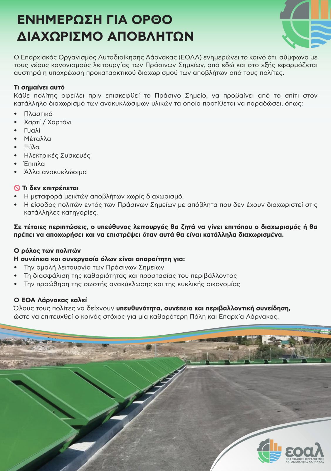 Ο Επαρχιακός Οργανισμός Αυτοδιοίκησης Λάρνακας ενημερώνει το κοινό ότι, σύμφωνα με τους κανονισμούς λειτουργίας των Πράσινων Σημείων, εφαρμόζεται αυστηρά η υποχρέωση προκαταρκτικού διαχωρισμού των αποβλήτων από τους πολίτες πριν την παράδοσή τους.