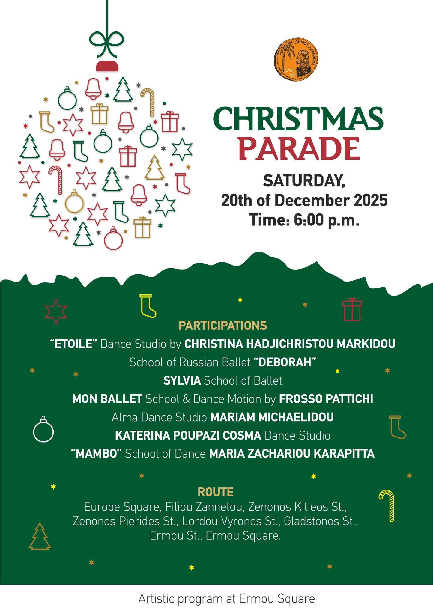 Ο Δήμος Λάρνακας σας προσκαλεί στην καθιερωμένη Χριστουγεννιάτικη παρέλαση, το Σάββατο 20 Δεκεμβρίου 2025 στις 6:00 μ.μ.