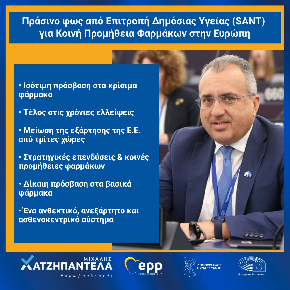 Σημαντικό ορόσημο για την ευρωπαϊκή πολιτική Υγείας αποτελεί η υπερψήφιση, από την Επιτροπή Δημόσιας Υγείας (SANT) του Ευρωπαϊκού Κοινοβουλίου, της εισήγησης του Ευρωβουλευτή του ΔΗΣΥ και του ΕΛΚ κ. Μιχάλη Χατζηπαντέλα, για την κοινή προμήθεια φαρμάκων μεταξύ των κρατών-μελών της Ευρωπαϊκής Ένωσης.