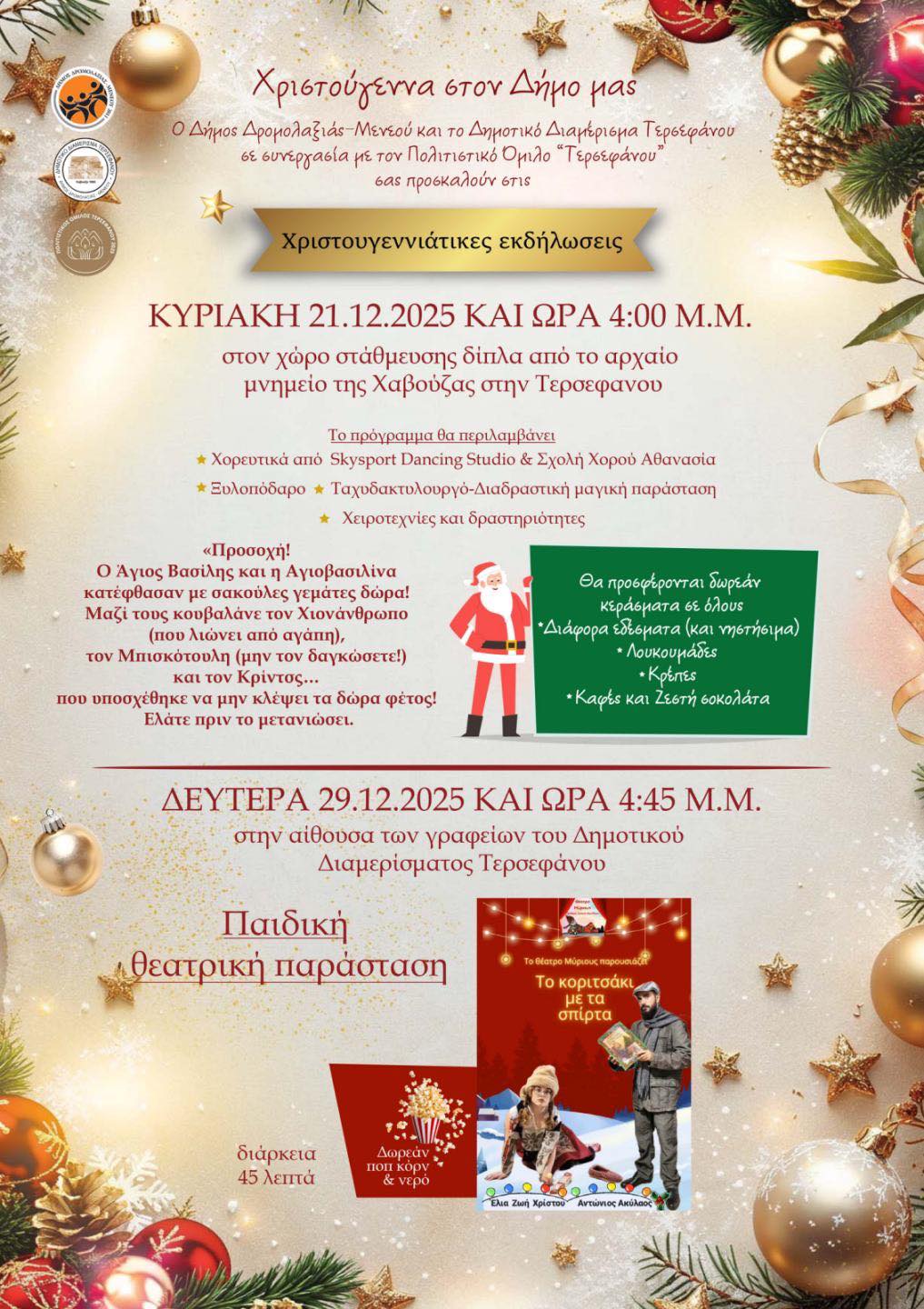 Παιδική Θεατρική Παράσταση τη Δευτέρα 29/12/2025 και ώρα 4:45 μ.μ. στην Αίθουσα των γραφείων του Δημοτικού Διαμερίσματος Τερσεφάνου «Το κοριτσάκι με τα σπίρτα». Διάρκεια: 45 λεπτά. Δωρεάν ποπ κορν & νερό.