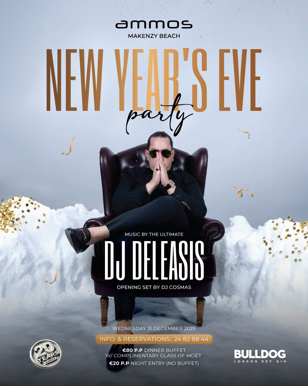 Το event περιλαμβάνει dinner buffet, complimentary ποτήρι Moët και ένα περιβάλλον που συνδυάζει γιορτινή πολυτέλεια με σύγχρονο nightlife χαρακτήρα, ενώ τη βραδιά υποστηρίζει το Bulldog London Dry Gin.