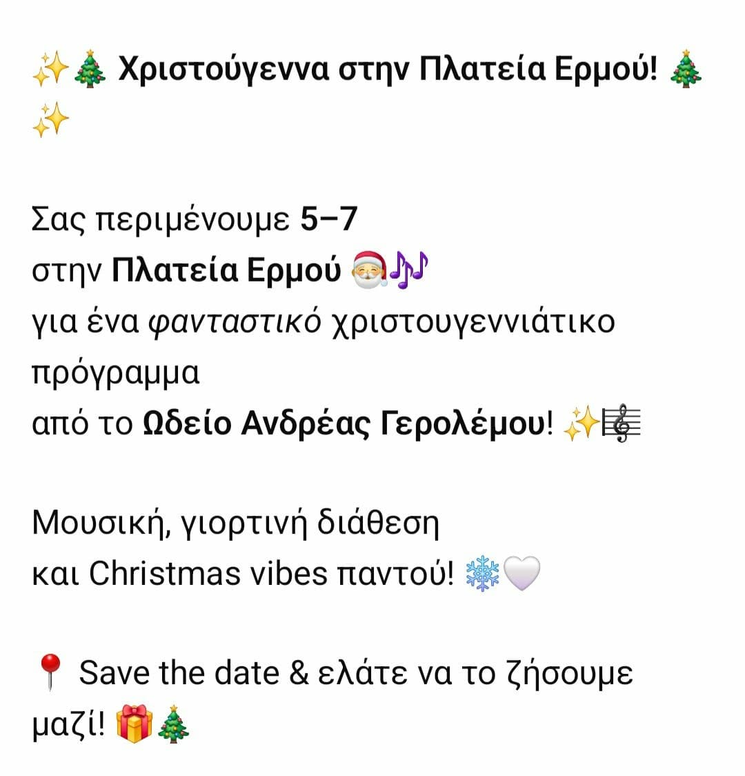 Χριστουγεννιάτικες μελωδίες στην Πλατεία Ερμού από το Ωδείο Ανδρέας Γερολέμου σήμερα το απόγευμα!