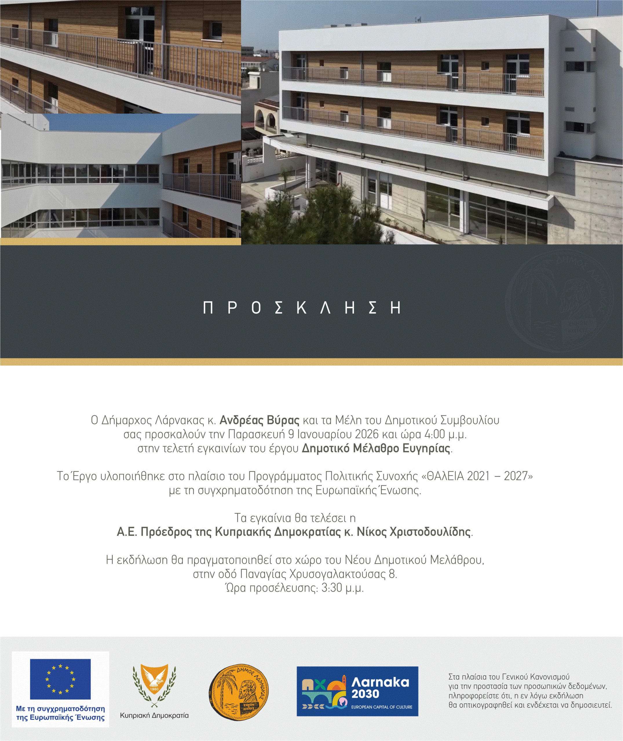 Ο Δήμαρχος Λάρνακας, κ. Ανδρέας Βύρας, και τα Μέλη του Δημοτικού Συμβουλίου, σας προσκαλούν στην τελετή εγκαινίων του νέου Δημοτικού Μελάθρου Ευγηρίας, που θα πραγματοποιηθεί την Παρασκευή, 9 Ιανουαρίου 2026, στις 4:00 μ.μ., στην οδό Παναγίας Χρυσογαλακτούσας 8. Η προσέλευση των καλεσμένων θα ξεκινήσει στις 3:30 μ.μ.