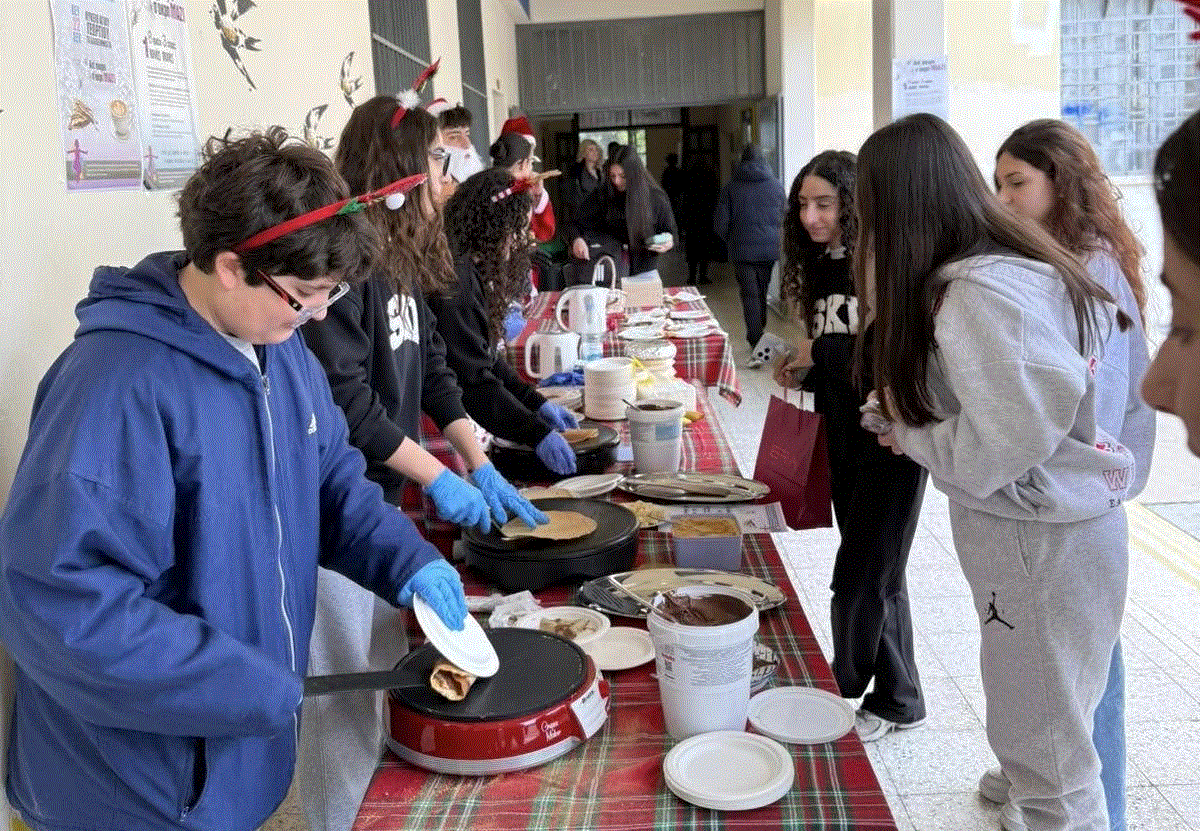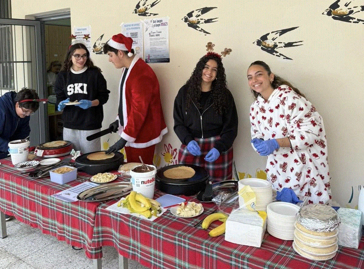 Οι μαθήτριες και οι μαθητές συμμετείχαν με ενθουσιασμό στην προετοιμασία και τις πωλήσεις κρεπών και ζεστών ροφημάτων, στέλνοντας ένα δυνατό μήνυμα αλληλεγγύης και προσφοράς.