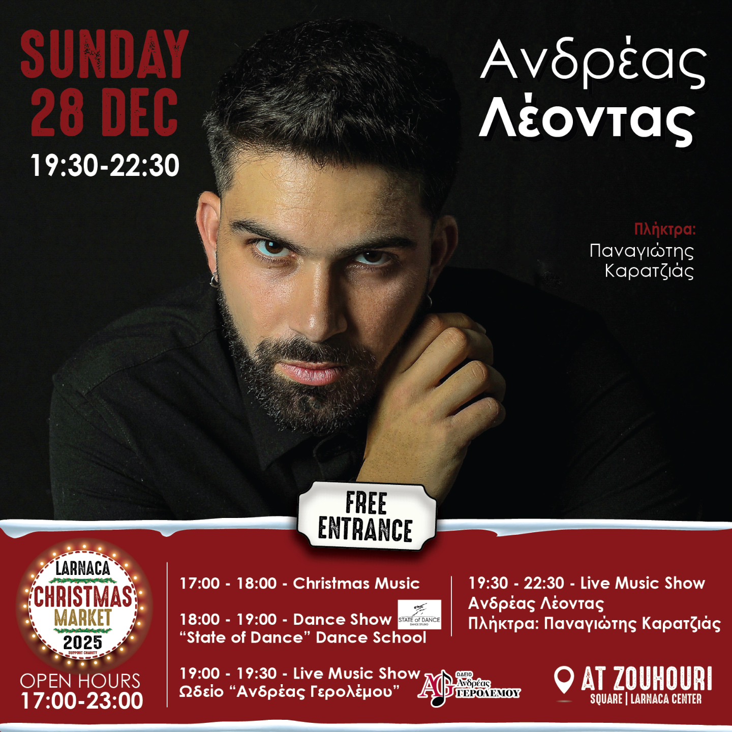 Tην Κυριακή 28/12, απολαμβάνουμε dance show από την σχολή @state.of.dancecy, συνεχίζουμε με το Ωδείο του Ανδρέα Γερολέμου, και κλείνουμε το βράδυ με ένα εντεχνολαϊκό live music πρόγραμμα με τον υπέροχο Ανδρέα Λέοντα.