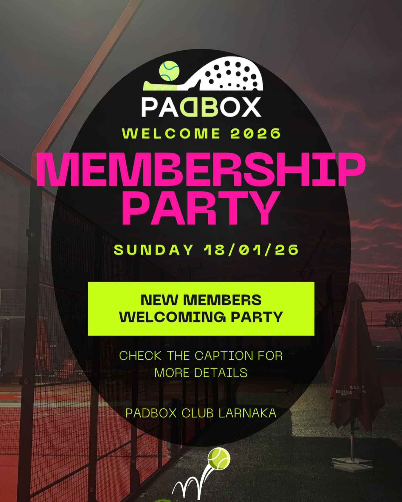 Το PADBOX Club Larnaka μπαίνει στο 2026 με τον πιο fun τρόπο, τουρνουά padel και μεγάλο members party την Κυριακή 18 Ιανουαρίου 2026.