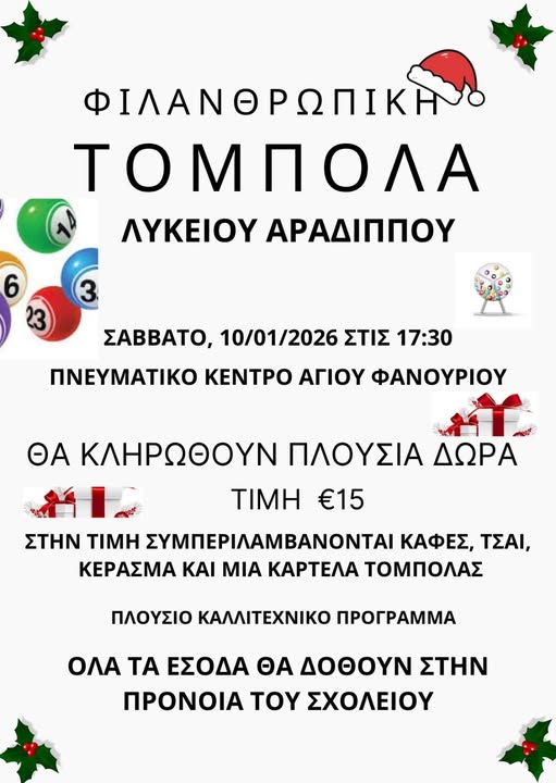 Η Επιτροπή Κοσμητείας και Πρόνοιας του Λυκείου Αραδίππου “Τάσος Μητσόπουλος”, διοργανώνει Φιλανθρωπική Τόμπολα, στο πλαίσιο της ευρύτερης προσπάθειας για ενίσχυση του Ταμείου Πρόνοιας το Σάββατο 10 Ιανουαρίου 2026 και ώρα 5.30 μ.μ. στο Πνευματικό Κέντρο Αγίου Φανουρίου.