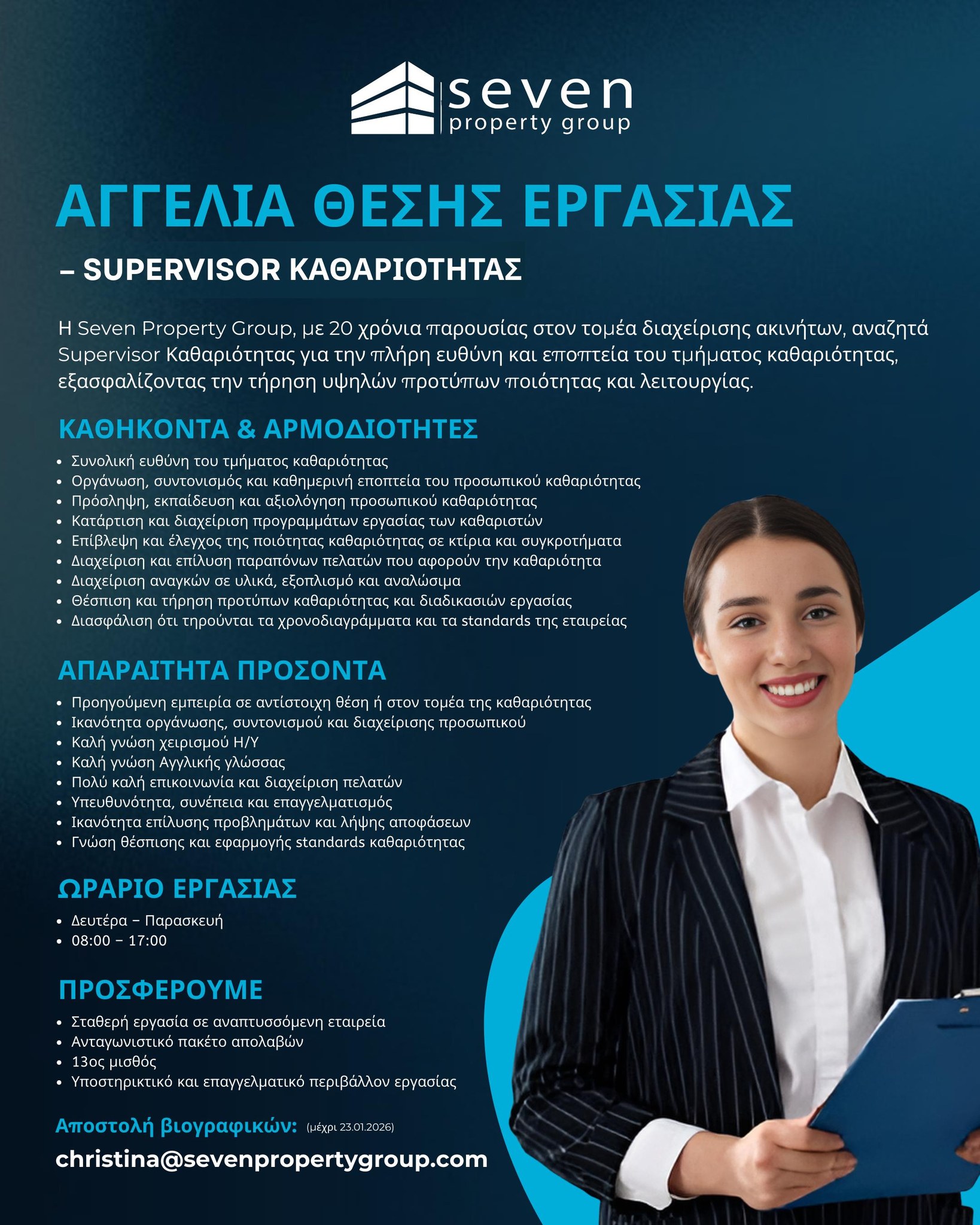 Η Seven Property Group αναζητά έμπειρο Supervisor Καθαριότητας για πλήρη απασχόληση.