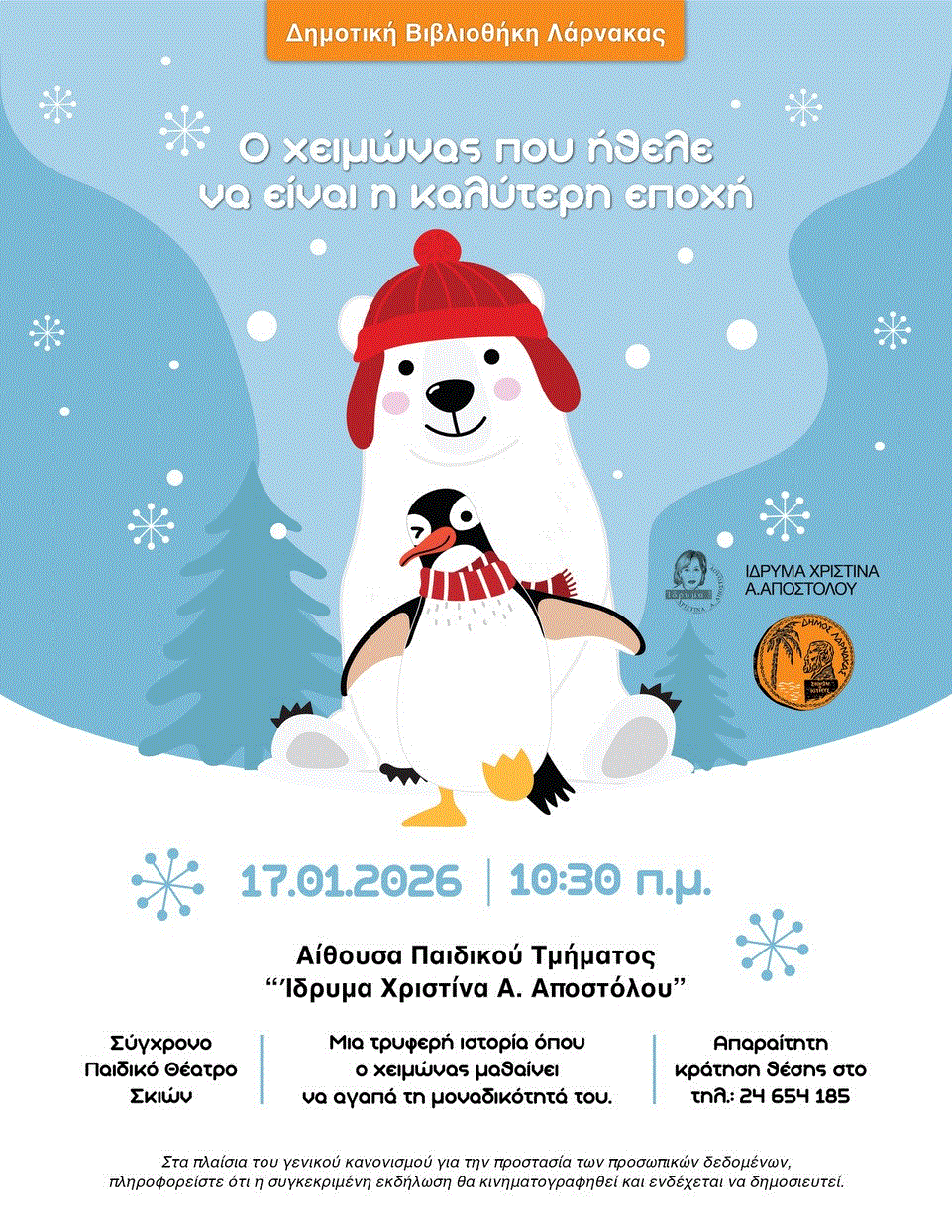 Home ΛΑΡΝΑΚΑ ΕΚΔΗΛΩΣΕΙΣ Η παιδική θεατρική παράσταση “Ο χειμώνας που ήθελε να είναι η καλύτερη εποχή” αυτό το Σάββατο στη Δημοτική Βιβλιοθήκη Λάρνακας