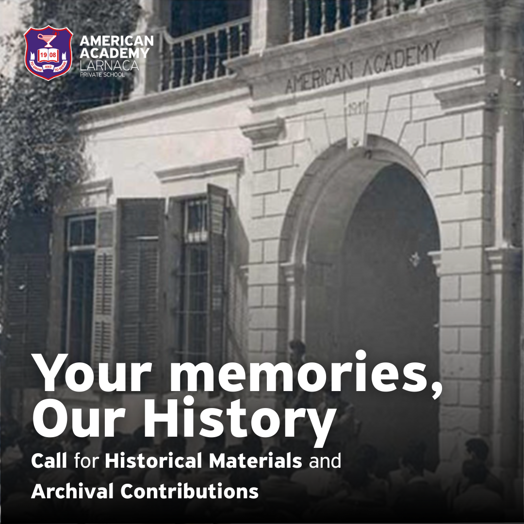 Η Αμερικανική Ακαδημία Λάρνακας απευθύνει ανοικτή πρόσκληση προς τους Αποφοίτους και τους Φίλους της, καλώντας τους να συμβάλουν στη συγκέντρωση και καταγραφή ιστορικού υλικού που αφορά την πορεία και την προσφορά του σχολείου από την ίδρυσή του έως σήμερα.