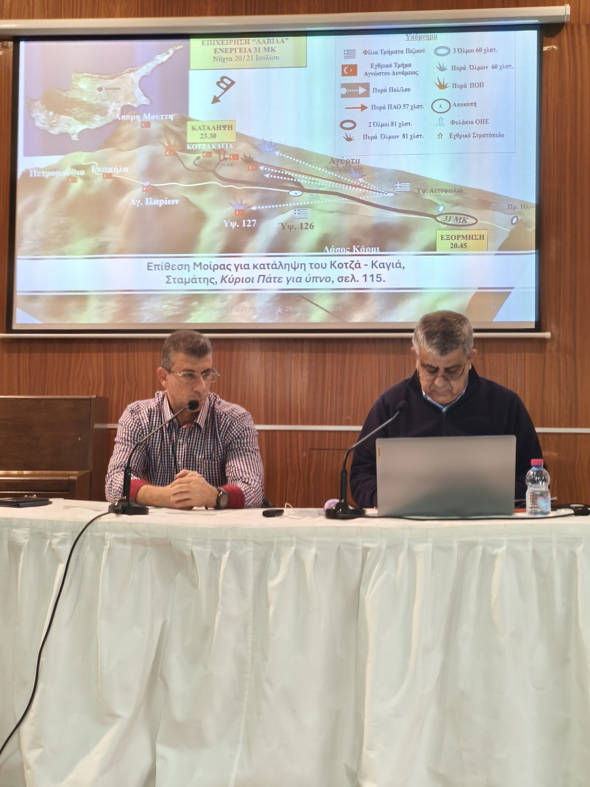 Ο κ. Χρυσοστόμου προέβη σε σύντομη αναφορά στο ιστορικό της Μοίρας, με κύρια εστίαση στη δράση της κατά την κρίσιμη περίοδο του 1974. Η 31 ΜΚ, με έδρα την Αθαλάσσα στο στρατόπεδο Ηλία Παπακυριακού, ξεκίνησε από τη βάση της για να συμμετάσχει στα γεγονότα της 15ης Ιουλίου 1974. Μετά την ολοκλήρωση του πραξικοπήματος και τη μεταστάθμευσή της στον χώρο στρατωνισμού του Εφεδρικού Σώματος παρά το Γ.Ε.Ε.Φ., κινήθηκε προς τον Πενταδάκτυλο, όπου ενεπλάκη σε μάχες πρωταρχικής σημασίας. Ιδιαίτερη αναφορά έγινε στη συμμετοχή της 31 ΜΚ, μαζί με τις 33 ΜΚ και 32 ΜΚ, στην εφαρμογή του σχεδίου «Λαβίδα», δηλαδή στον έλεγχο της διάβασης της Αγύρτας. Παράλληλα, παρουσιάστηκαν σημαντικές επιχειρησιακές στιγμές που συνδέθηκαν με τα υψώματα Κοτζά-Καγιά, 126, την Αετοφωλιά, τον Καραβά και το Πιλέρι, όπου η Μοίρα κατέγραψε σελίδες ηρωισμού και αυτοθυσίας.