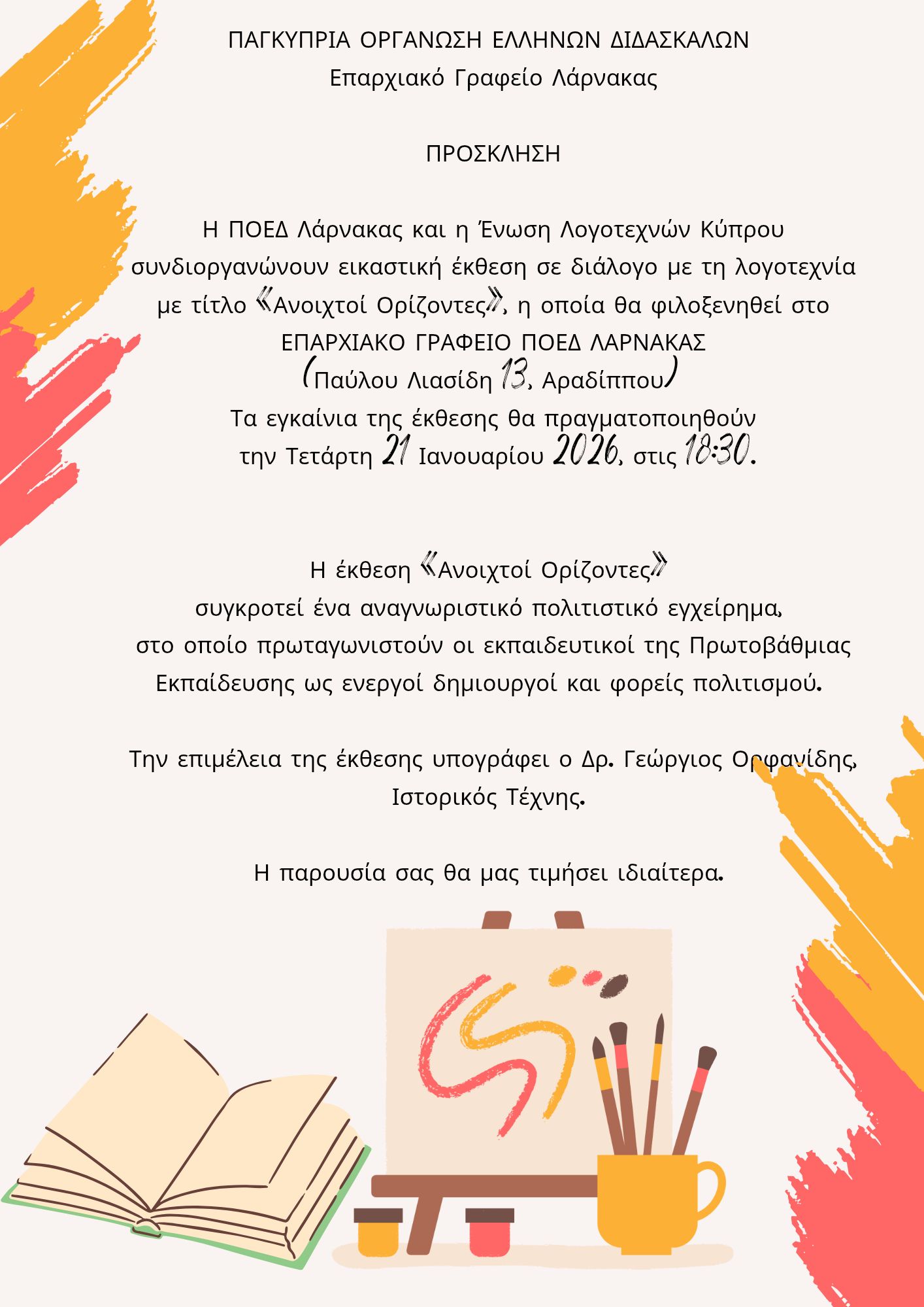 Home ΛΑΡΝΑΚΑ ΕΚΔΗΛΩΣΕΙΣ Αλλαγή στο ωράριο και στον χώρο διεξαγωγής της εικαστικής έκθεσης της ΠΟΕΔ Λάρνακας