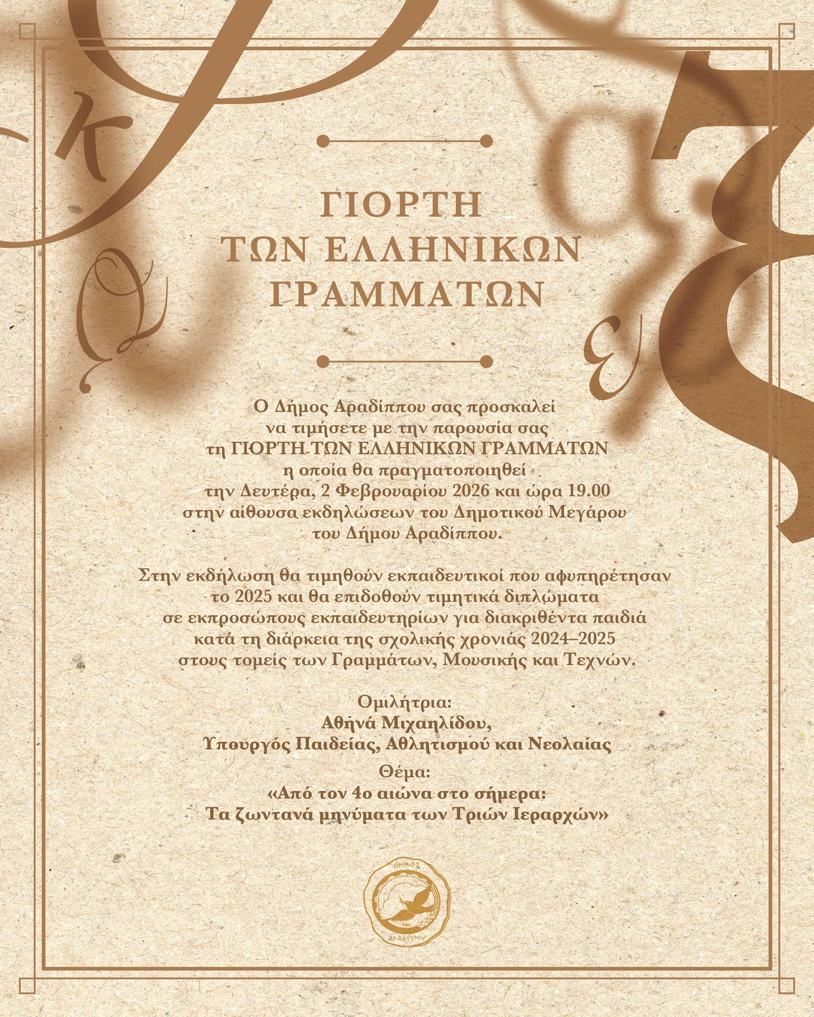 Ο Δήμος Αραδίππου σας προσκαλεί στη Γιορτή των Ελληνικών Γραμμάτων, με κεντρική ομιλήτρια την Αθηνά Μιχαηλίδου, Υπουργό Παιδείας, Αθλητισμού και Νεολαίας, με θέμα: «Από τον 4ο αιώνα στο σήμερα: Τα ζωντανά μηνύματα των Τριών Ιεραρχών».