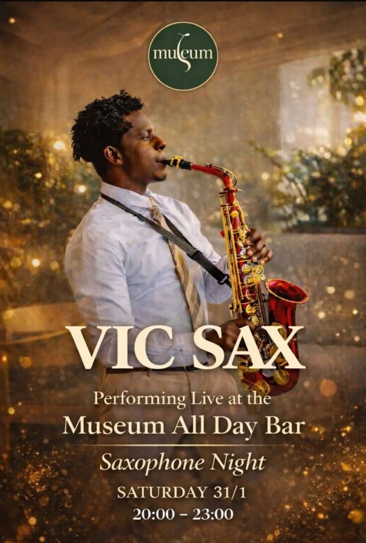 Ο Vic Sax, με τον δυναμικό αλλά ταυτόχρονα αισθαντικό ήχο του, δημιουργεί το ιδανικό soundtrack για ένα χαλαρό dinner, ένα ποτήρι κρασί ή ένα cocktail με παρέα. Jazz, soul και σύγχρονα vibes μπλέκονται αρμονικά, χαρίζοντας στο Museum μια ατμόσφαιρα που θυμίζει ευρωπαϊκές βραδιές lounge.