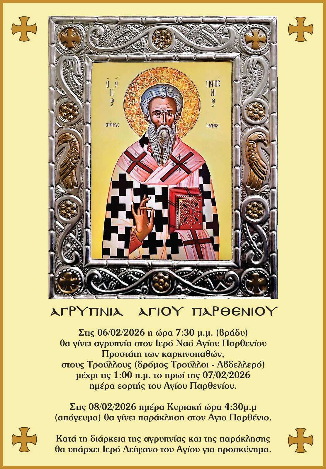 Την Παρασκευή 6 Φεβρουαρίου 2026 και ώρα 7.30 μ.μ., θα πραγματοποιηθεί Αγρυπνία στον Ιερό Ναό Αγίου Παρθενίου, προστάτη των Καρκινοπαθών στους Τρούλλους, (δρόμος Τρούλλων – Αβδελλερού μέχρι τις 1.00 π.μ. τα ξημερώματα της 7.2.2026 ημέρας της Εορτής του Αγίου Παρθενίου.