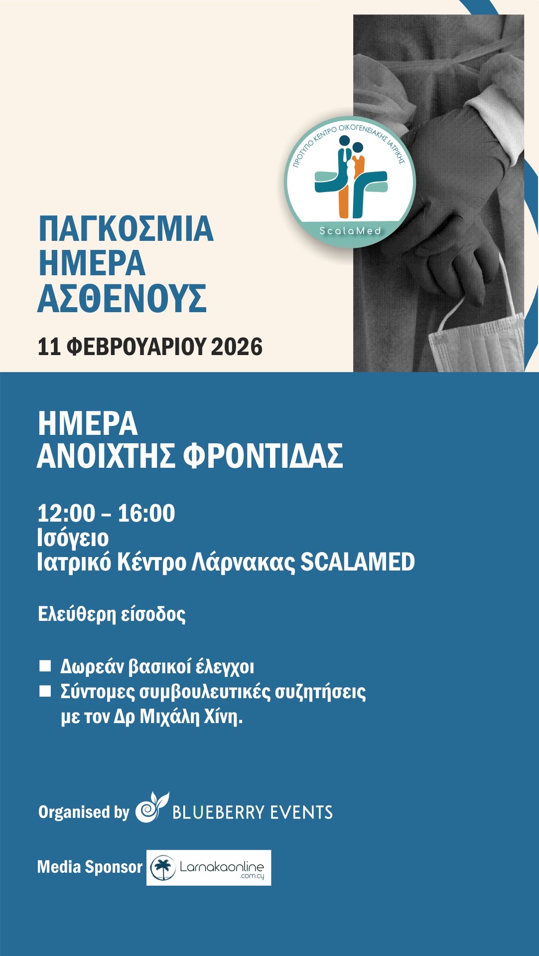 Με αφορμή την Παγκόσμια Ημέρα Ασθενούς, το Ιατρικό Κέντρο Λάρνακας SCALAMED, διοργανώνει την «Ημέρα Ανοιχτής Φροντίδας», την Τετάρτη 11 Φεβρουαρίου 2026, από τις 12:00 έως τις 16:00, στο ισόγειο του Ιατρικού Κέντρου.