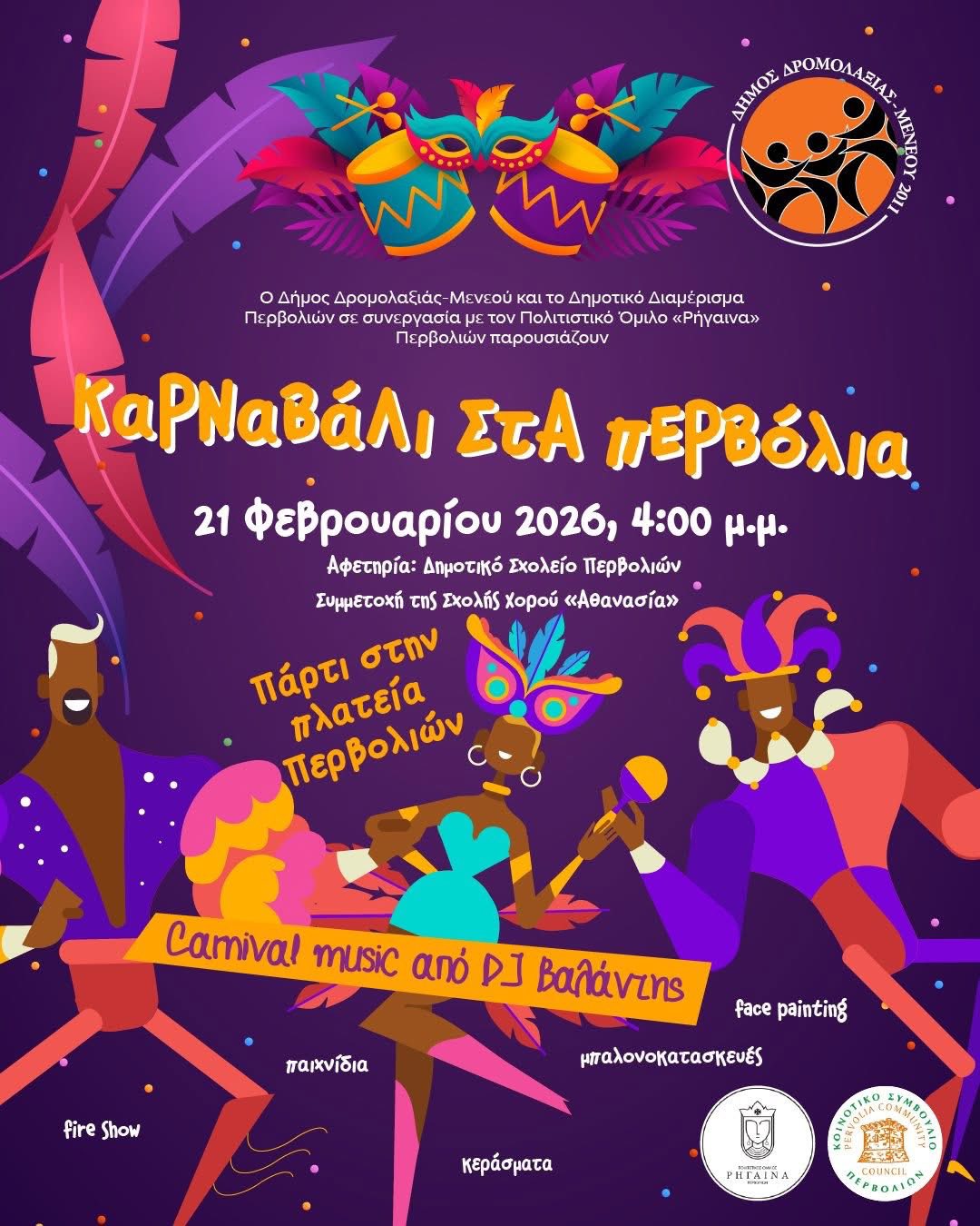 Ο Δήμος Δρομολαξιάς–Μενεού ο Πολιτιστικός Όμιλος “Ρήγαινα” Περβολιών και το Δημοτικό Διαμέρισμα Περβολιών σας προσκαλούν σε μια μεγάλη αποκριάτικη γιορτή γεμάτη μουσική, χορό και χαμόγελα το Σάββατο 21 Φεβρουαρίου 2026 και ώρα 4:00 μ.μ. στο Δημοτικό Σχολείο Περβολιών.