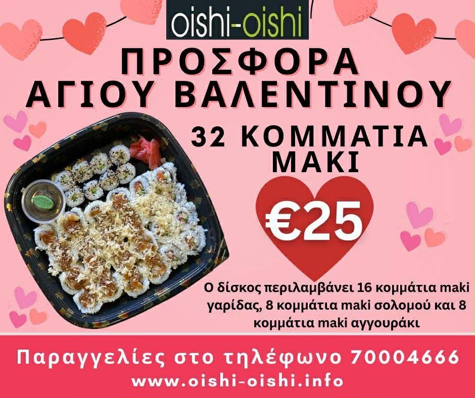 Με αφορμή την Ημέρα του Αγίου Βαλεντίνου στις 14 Φεβρουαρίου 2026, το Oishi Oishi παρουσιάζει μια ξεχωριστή προσφορά για τους λάτρεις του sushi. Σε γιορτινή, ρομαντική διάθεση, το κατάστημα προσφέρει δίσκο με 32 κομμάτια maki στην τιμή των €25.