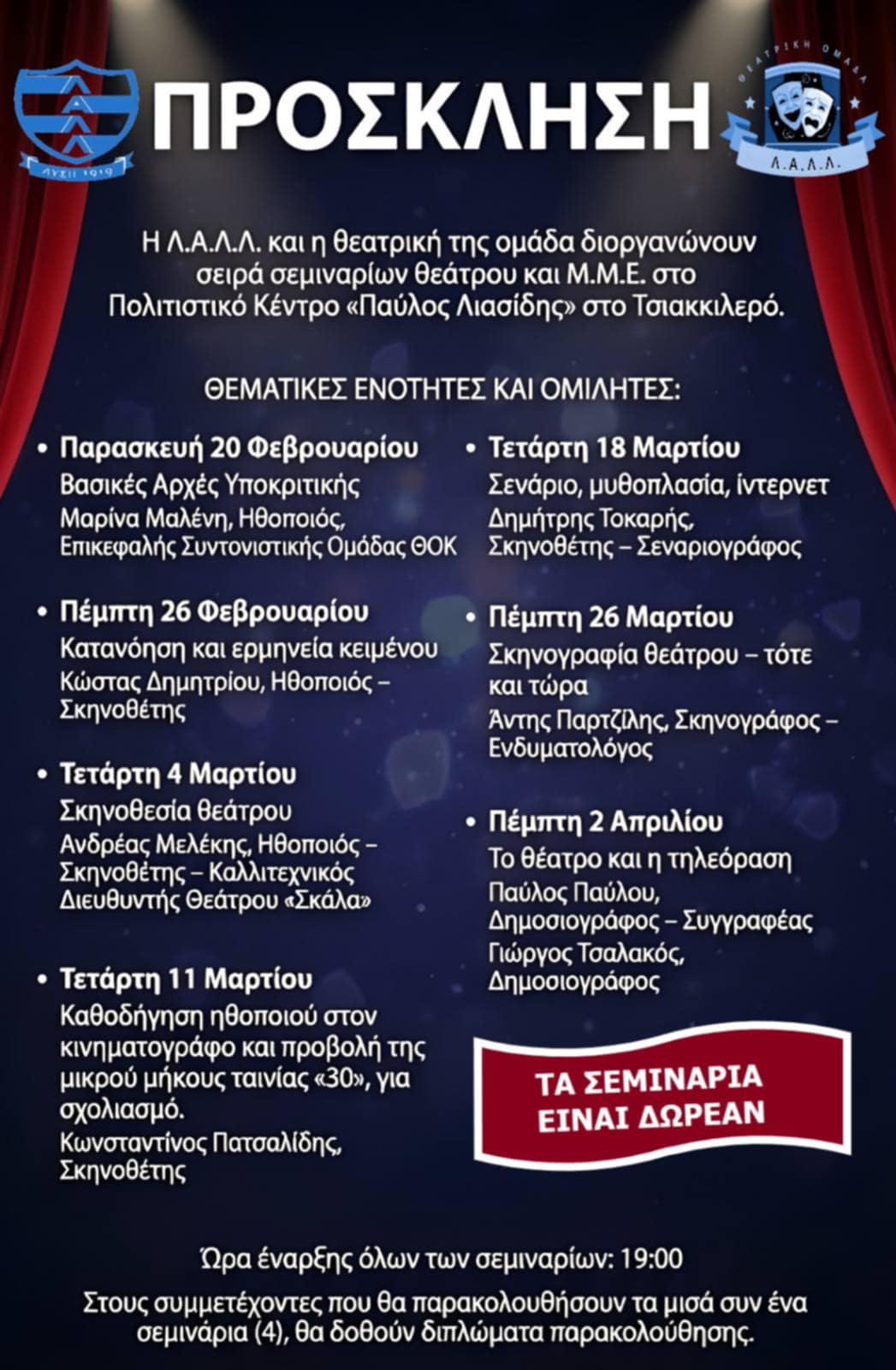 Τα σεμινάρια θα ξεκινήσουν από την Παρασκευή 20 Φεβρουαρίου μέχρι την Πέμπτη 20 Απριλίου. Η ώρα έναρξης όλων των σεμιναρίων είναι στις 7μ.μ. Τα σεμινάρια θα είναι δωρεάν για το κοινό.