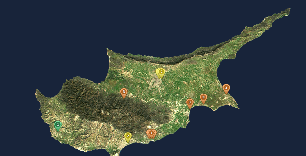 Στο «πορτοκαλί» βρίσκονται επίσης η Λάρνακα με 100,2 μg/m3, η Ορμήδεια με 108,7 μg/m3 και η περιοχή της Αγίας Μαρίνας Ξυλιάτου με 105,2 μg/m3.