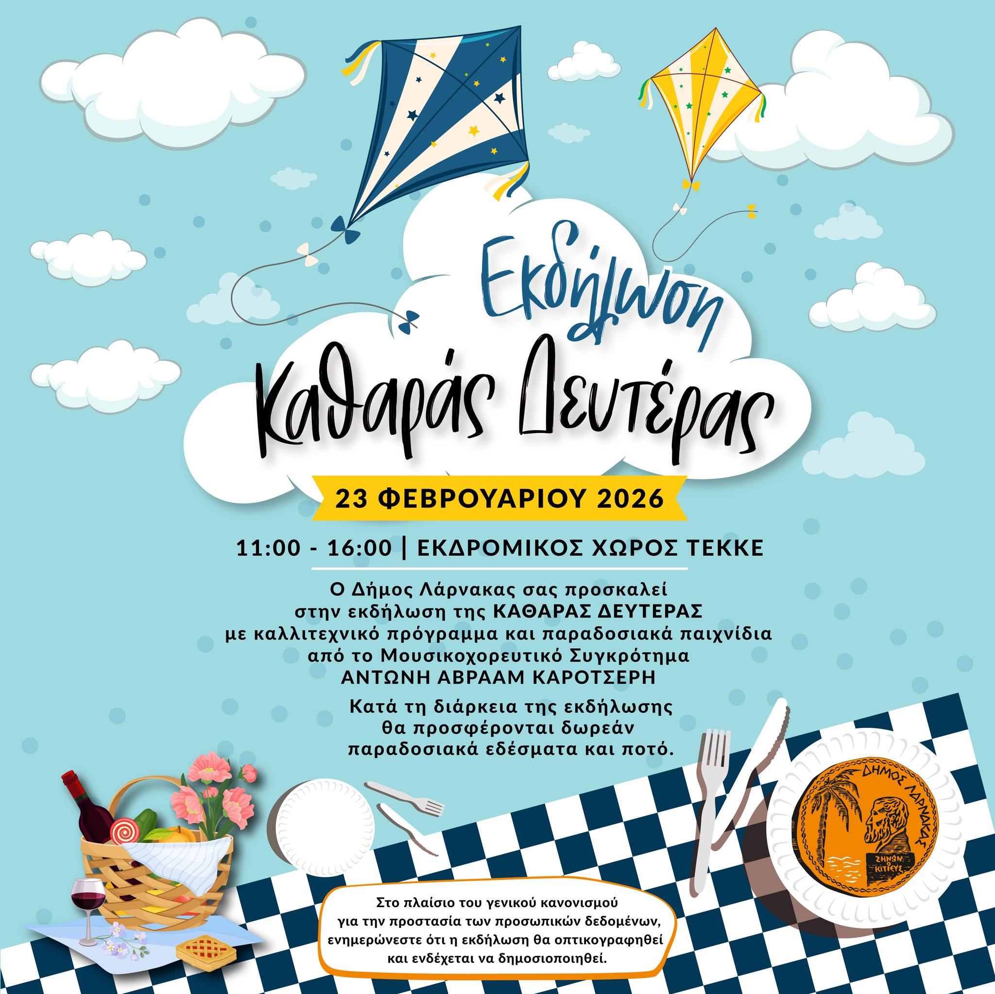 Ο Δήμος Λάρνακας προσκαλεί το κοινό να γιορτάσει την Καθαρά Δευτέρα σε μια ξεχωριστή εκδήλωση γεμάτη μουσική, χορό και παραδοσιακές γεύσεις. Τη Δευτέρα 23 Φεβρουαρίου 2026, από τις 11:00 έως τις 16:00, ο Εκδρομικός Χώρος Τεκκέ θα μετατραπεί σε σημείο συνάντησης για μικρούς και μεγάλους.