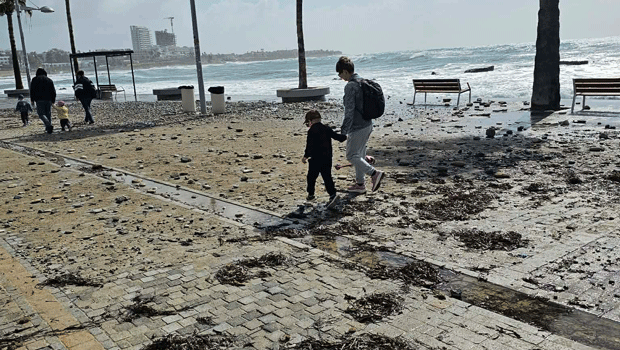 Τα ορμητικά κύματα μετέτρεψαν τον πεζόδρομο σε μια μάζα από πέτρες, άμμο και φερτά υλικά.