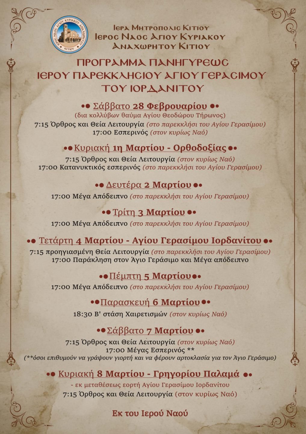 Ιερός Ναός Αγίου Κυριακού στο Κίτι για το Πρόγραμμα των Ιερών Ακολουθιών για την γιορτή του Αγίου Γερασίμου του Ιορδανίτου