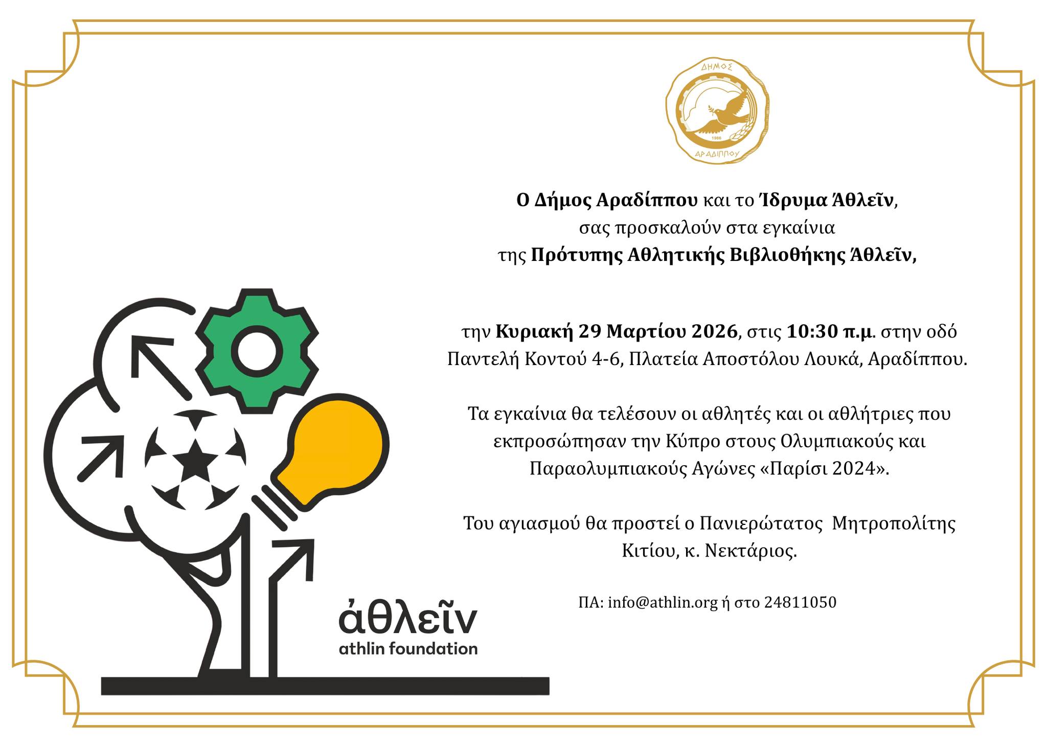 Ο Δήμος Αραδίππου και το Ίδρυμα Άθλεῖν, σας προσκαλούν στα εγκαίνια της Πρότυπης Αθλητικής Βιβλιοθήκης Άθλεῖν την Κυριακή 29 Μαρτίου 2026 και ώρα 10:30 π.μ. στην Πλατεία Αποστόλου Λουκά στην Αραδίππου.