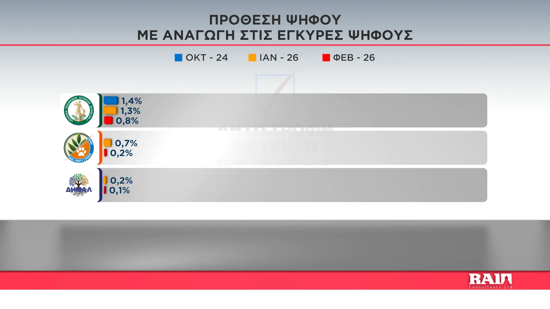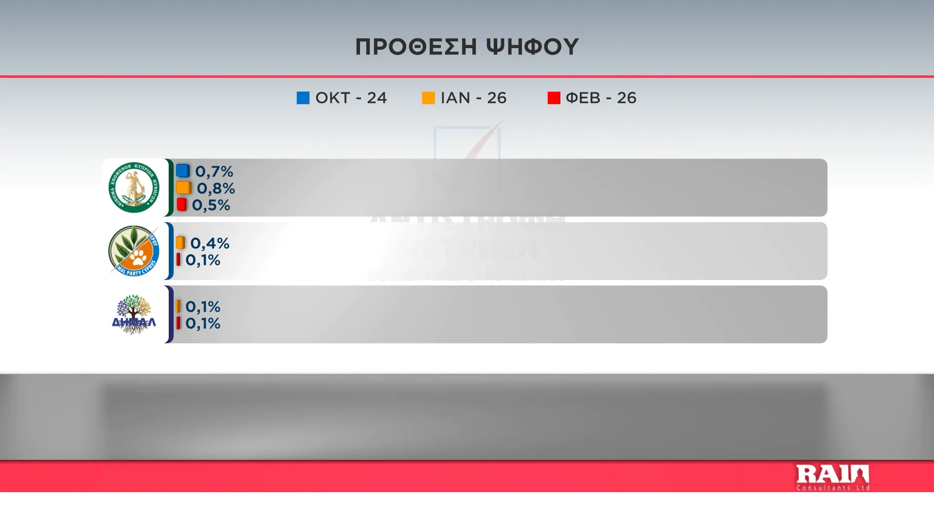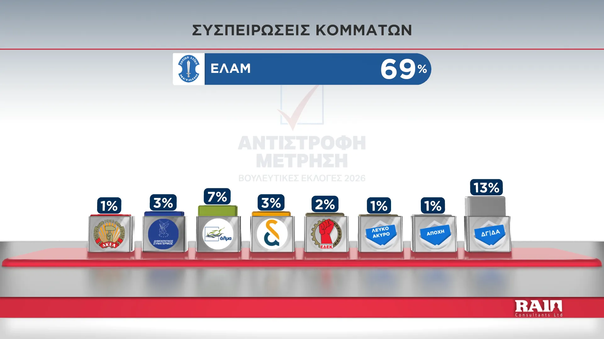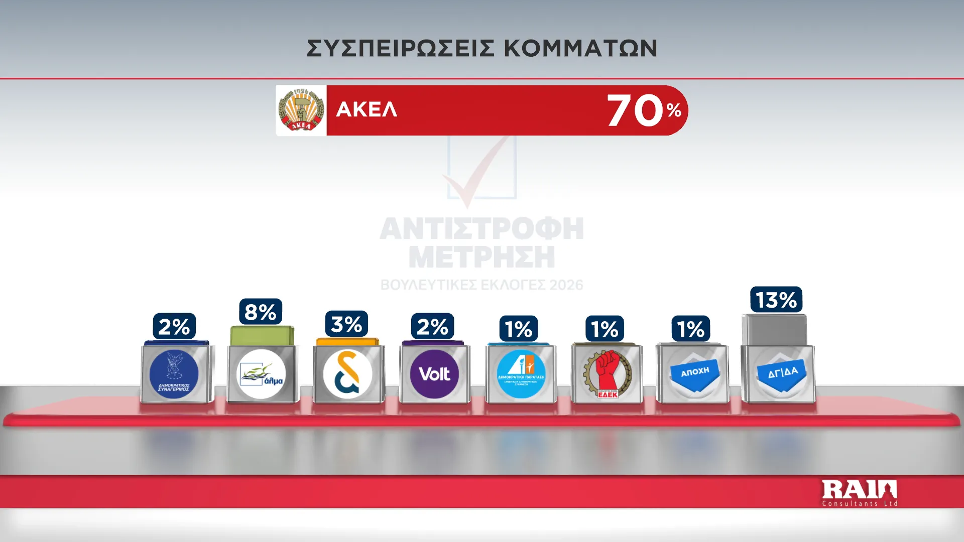 Τα αποτελέσματα παρουσίασε στην εκπομπή του Alpha Κύπρου «Αντίστροφη Μέτρηση» με την Αιμιλία Κενεβέζου, ο Εκτελεστικός Πρόεδρος της RAI Consultants Ολύμπιος Τουμάζου. Συμμετείχαν ο Διευθυντής Ειδήσεων του Alpha Κύπρου Γιώργος Κασκάνης και η Πολιτική αναλύτρια Μαρίνα Οικονομίδου.