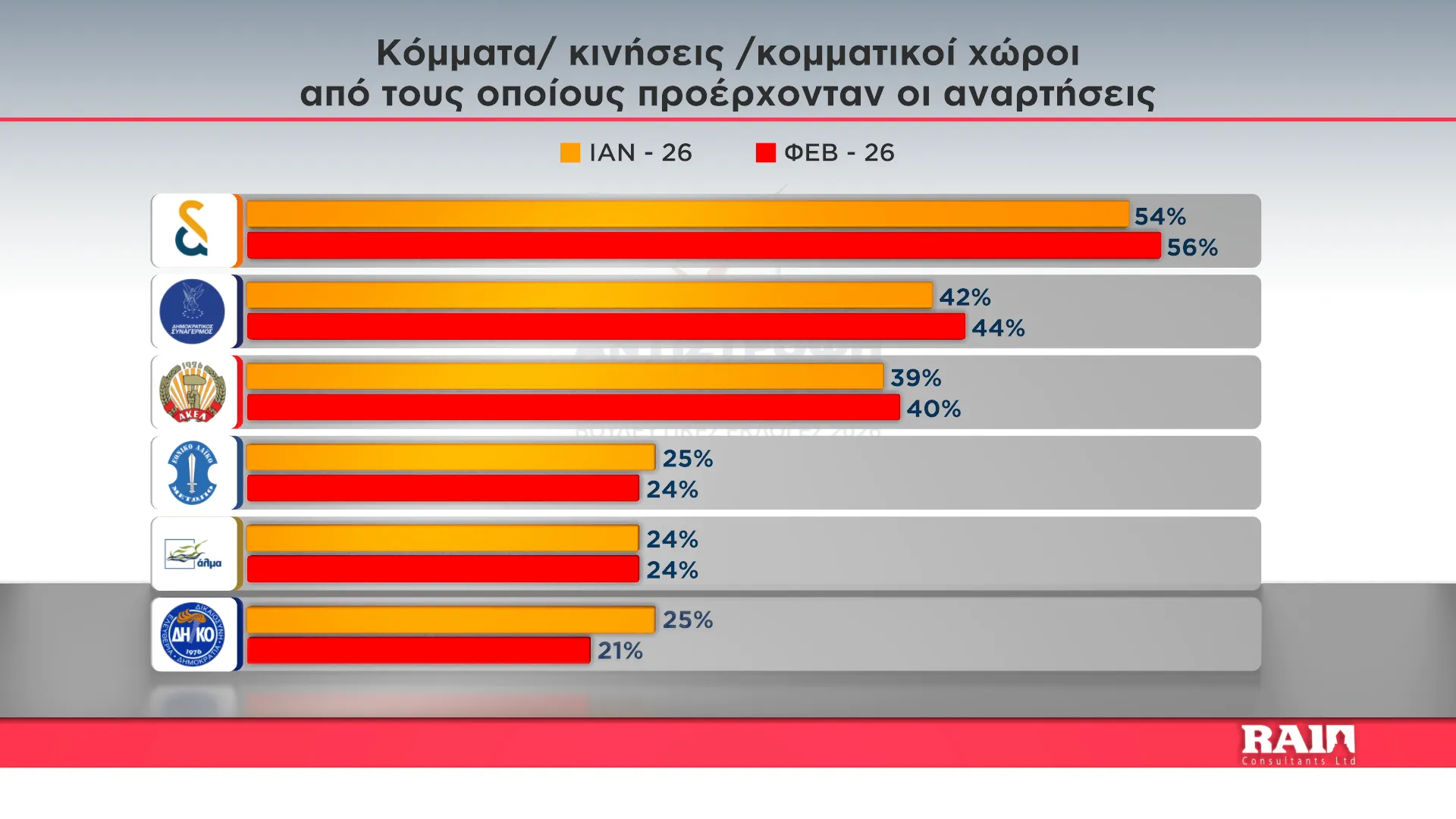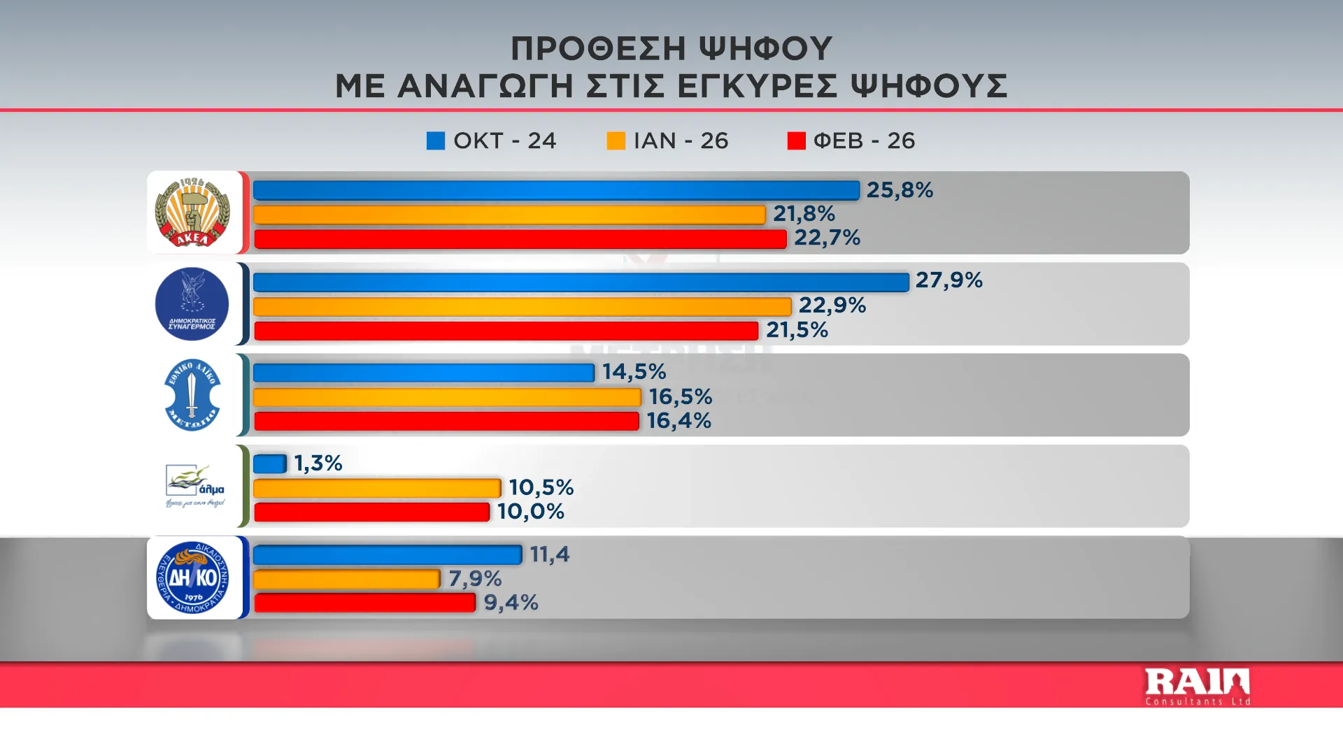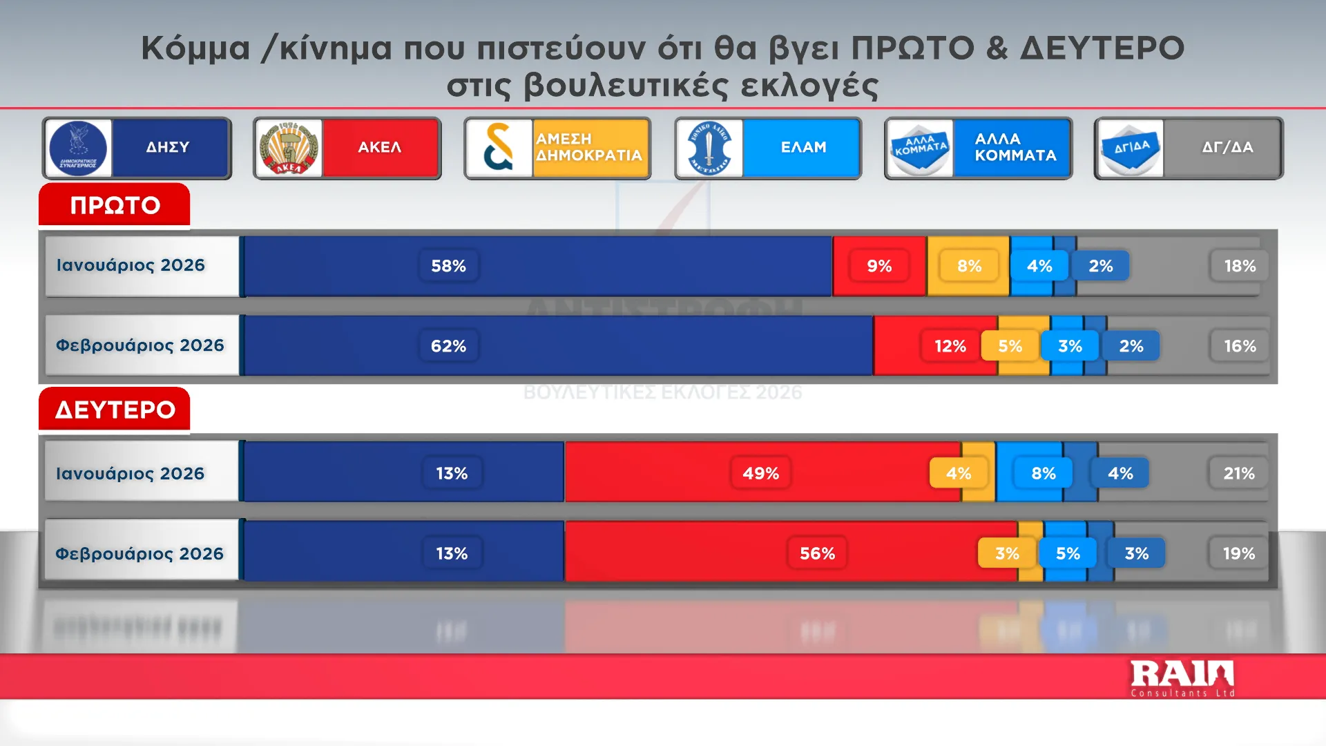 Το ΑΚΕΛ κατατάσσουν στην πρώτη θέση των επερχόμενων Βουλευτικών Εκλογών οι συμμετέχοντες στη νέα δημοσκόπηση που διενήργησε η εταιρεία Rai Consultants για λογαριασμό του Alpha Kύπρου. εντός του μηνός Φεβρουαρίου.