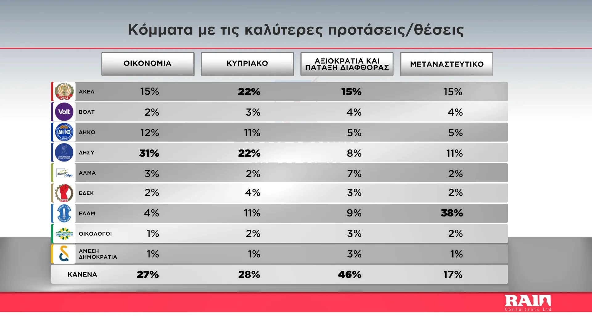 Αξιοσημείωτα είναι τα ευρήματα στην ερώτηση ποια κόμματα έχουν τις καλύτερες προτάσεις. Ο κανένας κερδίζει το υψηλό ποσοστό του 46% σε ότι αφορά στην αξιοκρατία και την πάταξη της διαφθοράς. Ενώ η Άμεση Δημοκρατία καταλαμβάνει την τελευταία θέση σε όλους τους τομείς.