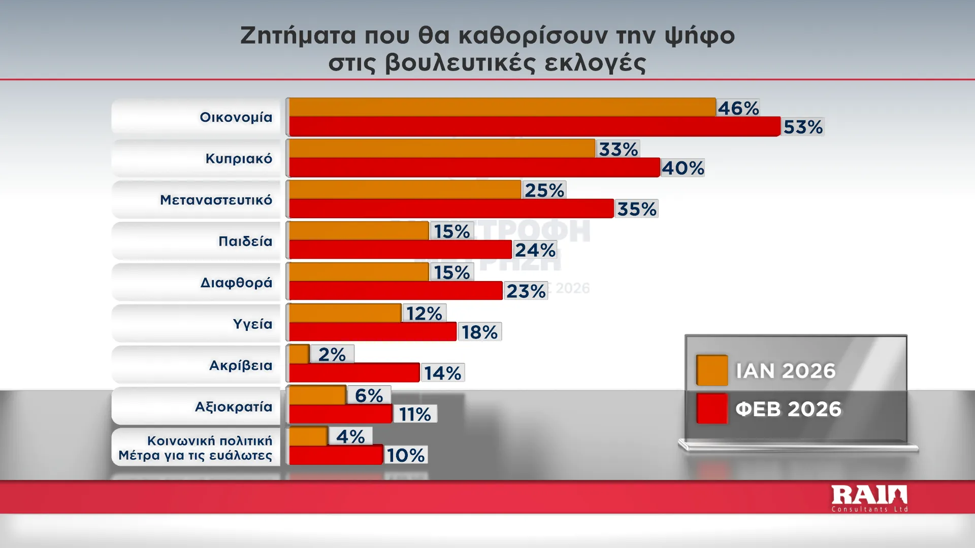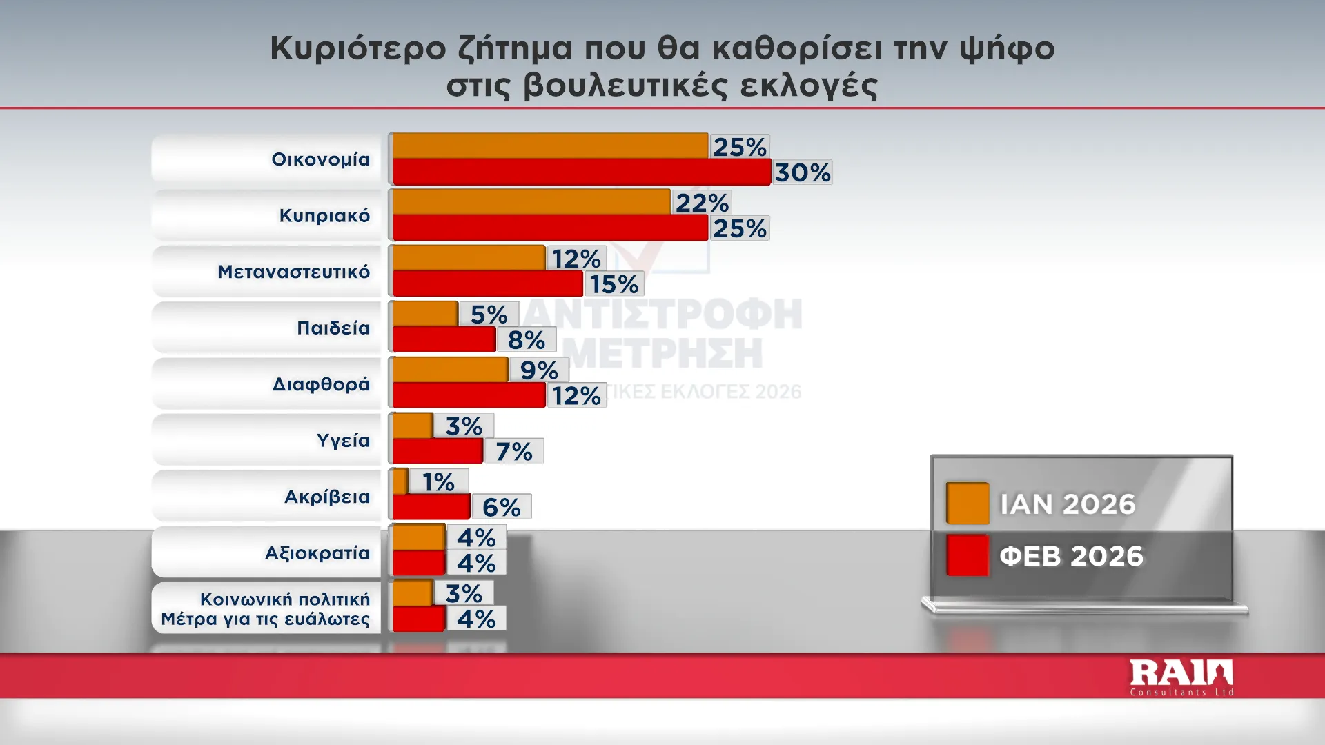 Κυριότερο ζήτημα που θα καθορίσει τη ψήφο των ερωτηθέντων στην έρευνα της Rai Consultants και του Alpha Κύπρου φαίνεται να είναι η οικονομία, καθώς 30% δηλώνει πως είναι το πιο σημαντικό. Ακολουθεί το Κυπριακό με 25%, το μεταναστευτικό με 15%, η διαφθορά με 12%, η Παιδεία με 8%, η Υγεία με 7%, η ακρίβεια με 6%, η αξιοκρατία με 4% και η κοινωνική πολιτική με 4%.