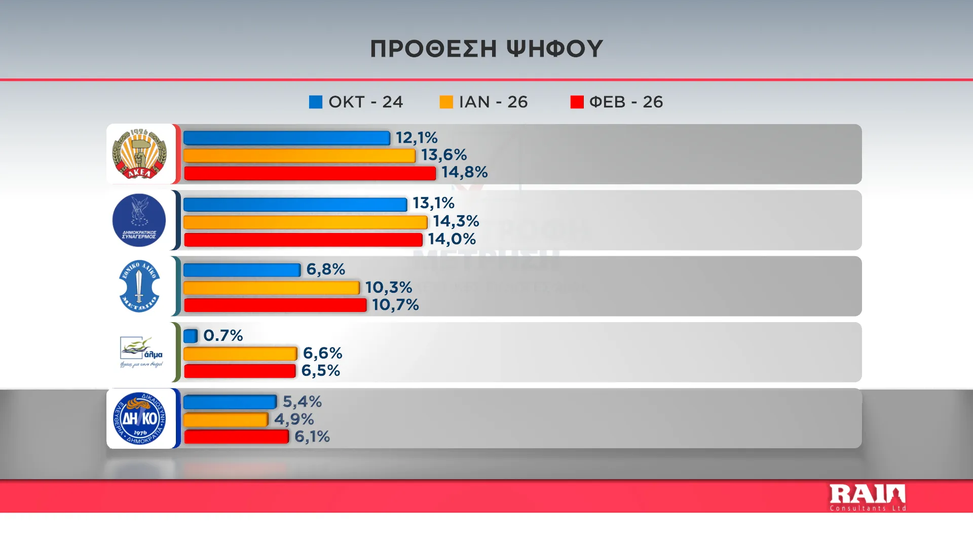 Στην πρόθεση ψήφου, το κόμμα της Αριστεράς συγκεντρώνει ποσοστό 14,8% και ακολουθεί ο ΔΗΣΥ με ποσοστό 14%. Τρίτο κόμμα αναδεικνύεται το ΕΛΑΜ με 10,7%, ενώ στην τέταρτη θέση βρίσκεται το «Άλμα» με 6.5%. Το ΔΗΚΟ καταγράφει σημαντική άνοδο σε σύγκριση με τον περασμένο μήνα συγκεντρώνοντας ποσοστό 6,1%.