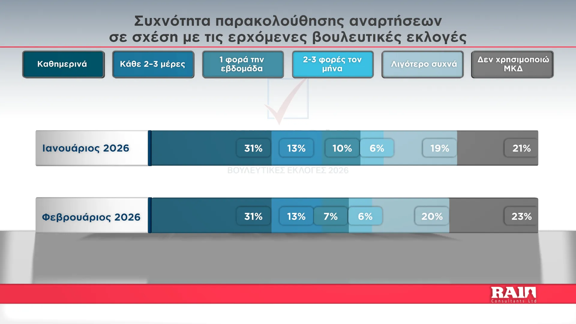 Η έρευνα Φεβρουαρίου καταγράφει για άλλη μια φορά τον σημαντικό ρόλο που διαδραματίζουν πλέον τα μέσα κοινωνικής δικτύωσης για το εκλογικό σώμα, που δείχνει να παρακολουθεί στενά τις ανακοινώσεις και τις αναρτήσεις κομμάτων και υποψηφίων.