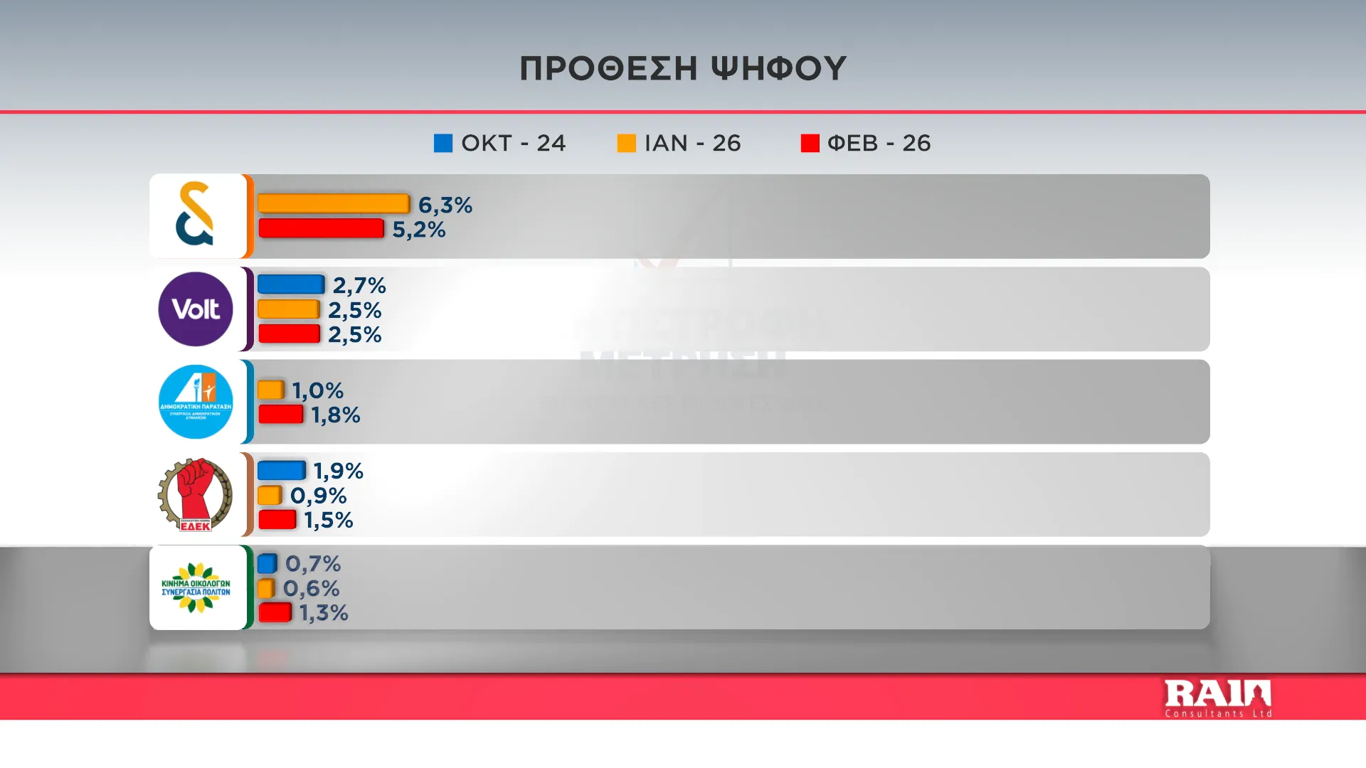 Μάχη για να μπει στη Βουλή φαίνεται πως θα δώσει το Volt με 2,5%, ενώ ακολουθούν η ΔΗΠΑ με 1,8%, η ΕΔΕΚ με 1,5%, οι Οικολόγοι με 1,3%, οι Κυνηγοί με 0,5%, η συνεργασία του Κόμματος των Ζώων με 0,1% και ΔΗΜΑΛ με 0,1%. Άκυρο ή λευκό δηλώνουν ότι θα ρίξουν 1,6% των ερωτηθέντων, ενώ 5,1% θα τηρήσουν αποχή. Αναπόφάσιστοι δηλώνουν το 20,7%.